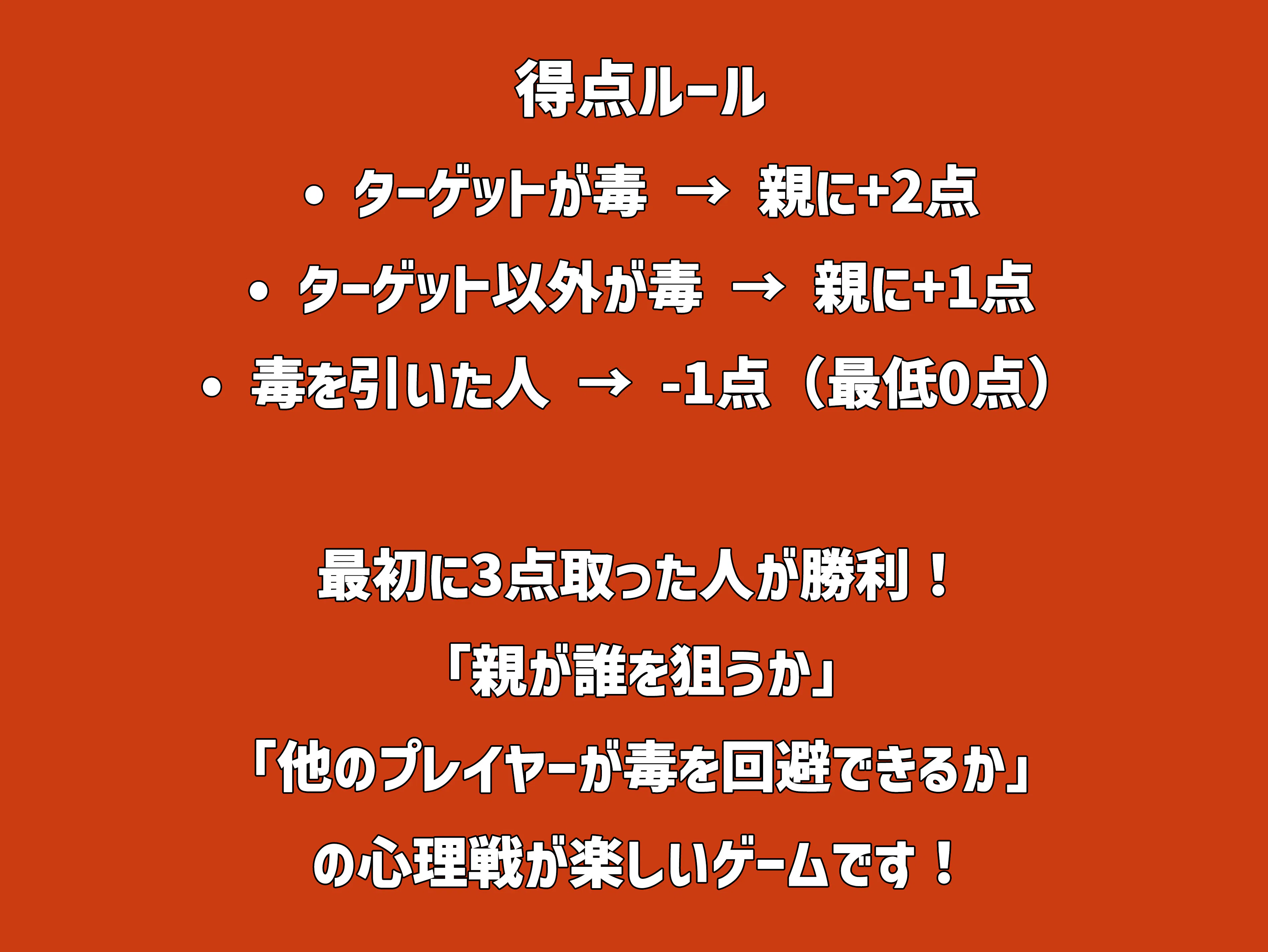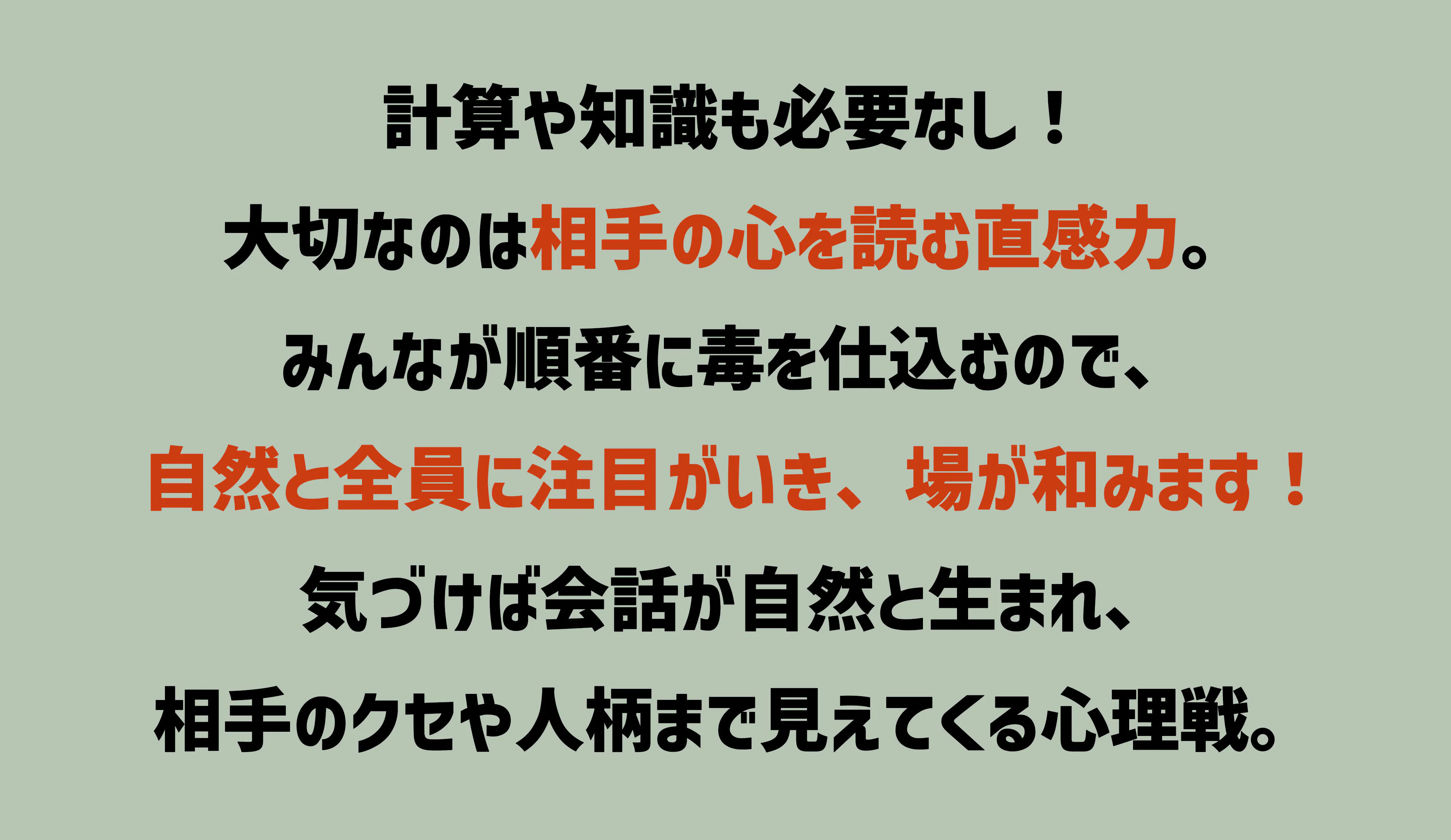 2025/11/26 07:00STUDIO FUNNNYをご支援くださる皆様!誠にありがとうございます。残り【5日】を切りました!!!本日は、ゲームのルールの話から一歩踏み込み、『カエデス』をより深く楽しむための「心理戦のヒント」について解説します。『カエデス』は、五賢帝の知識や複雑な計算は不要ですが、「人間の心」を読む力が勝敗を分けます。毒を仕込む側も、避ける側も、この知識を応用してみてください。毒の心理戦を制する!実戦で役立つ3つのヒント!『カエデス』は、毒の入った盃を交換し合うというシンプルなアクションの裏で、プレイヤーの心理が複雑に絡み合います。特に、「交換」や「交渉」の場面で無意識に出てしまう反応を観察することが重要です。ヒント①:会話中の「間(ま)」と「呼吸」を観察する人間は、心に大きな負荷がかかったり、重要な秘密を隠そうとしたりする時に、無意識に呼吸が浅くなったり、話の「間」が不自然に長くなったりする傾向があります。ゲームでの応用: あなたが「毒が入った盃」を押し付けようと交渉している時、相手の返答がいつもより一瞬でも遅れたら、それは「嘘をつく」か「判断に迷う」ための時間を稼いでいる可能性があります。逆に、間髪入れずに言葉が出た場合、それは真実である可能性が高いです(笑)ヒント②:指先や足元の「マイクロジェスチャー」に注目する意識的に顔の表情をポーカーフェイスで保とうとしても、体の末端は嘘をつけません。不安や緊張は、指先の動きや足の組み替えといった「マイクロジェスチャー」として現れます。ゲームでの応用: 自分の盃を交換しようと提案された時、相手の指先が少し震えていたり、テーブルの下で足を激しく組み替えていたりしたら要注意です。それは「早くこの場を終わらせたい」という心理の表れかもしれません。ヒント③:「オーバーなリアクション」は防御行動毒が入っていないにも関わらず、過剰に「えー!それは怖い!」とリアクションを取ったり、大げさに驚いたりする人は、自分の本心や状況から相手の注意を逸らそうとしている場合があります。ゲームでの応用: 必要以上に感情を露わにするプレイヤーは、実は「真実」を隠している可能性があります。冷静な人ほど毒を持っているとは限りません。カエデスで心理戦を極めるこれらのヒントは、実生活だけでなく、まさに『カエデス』のシンプルなルールだからこそ、より顕著に現れます。ぜひ、これらのヒントを頭に入れながら、次のゲームでは「裏切り」と「交渉」を成功させてみてください。ゲームを通じて心理学も学べる。これこそが、STUDIO FUNNNYが目指す「遊びを学びに」の真髄です。【最後に】残り6日間で「教養」をコンプリートしませんか?心理戦を極めたい方には、『カエデス』と『FIXER(裏金ゲーム)』のセットもおすすめです。『FIXER』もまた、政治とお金を巡る深い心理戦が楽しめます。ぜひ、お得なセットリターンを改めてご確認ください。 もっと見る