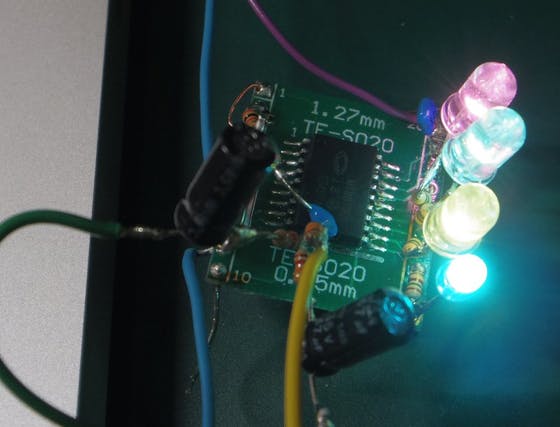 写真は初期のDTMFのICチップを使った原理試作品です。DTMF音を認識すると、LEDが光るようになっています。