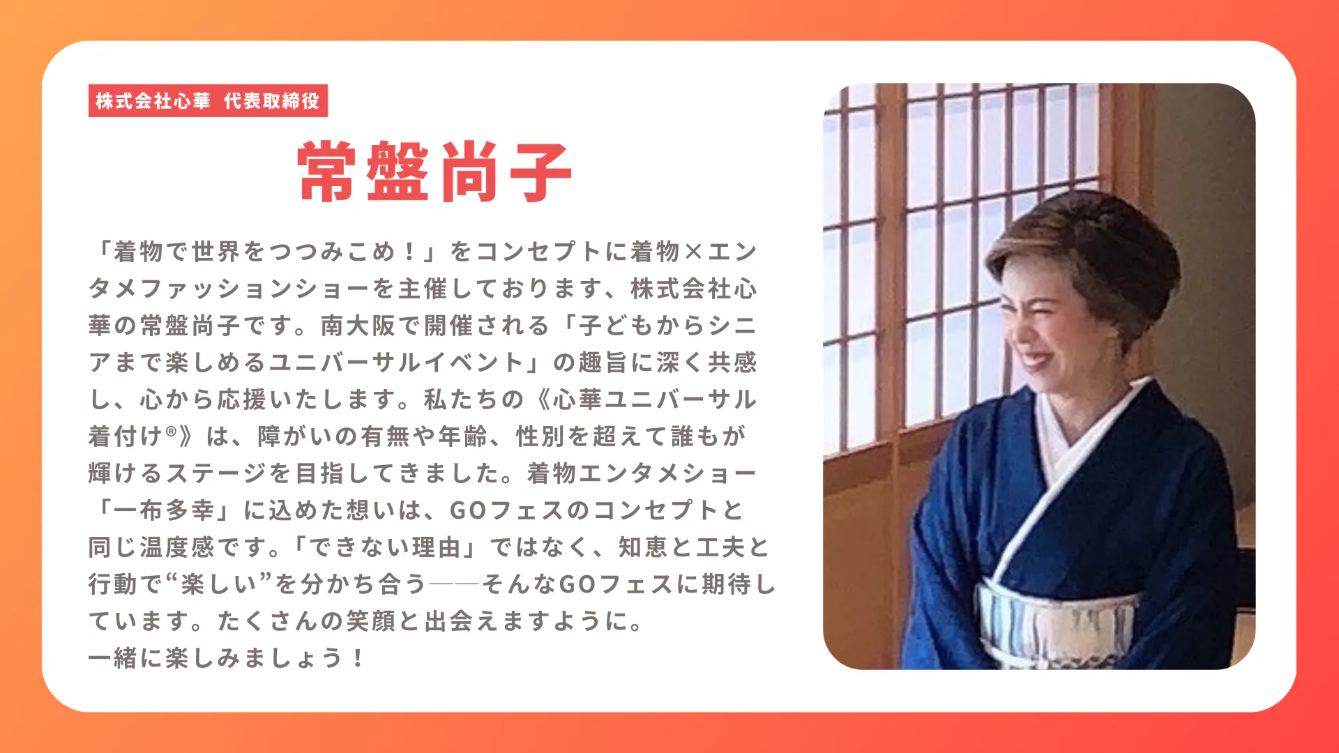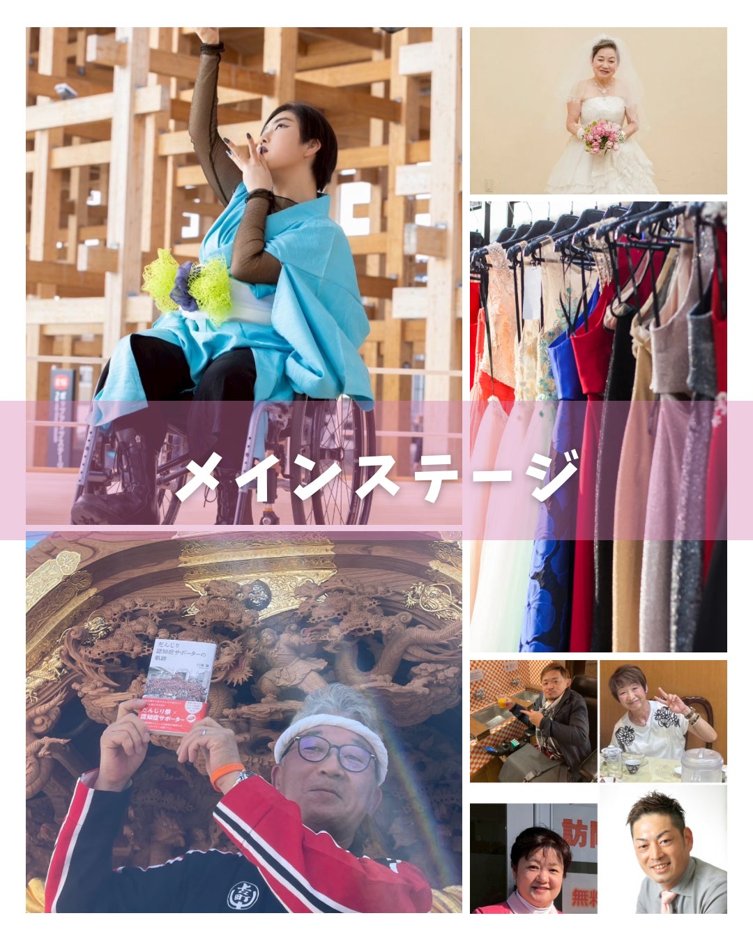 障害×着物の新感覚エンターテイメント!万博出演された(株)心華 常盤尚子 氏プロデュース、今回のステージでは、年齢・性別・障がいの有無をこえて、すべての人が輝ける世界をテーマに、日本の伝統文化・着物の魅力と“挑戦する楽しさ”を表現します。文化や芸術にふれることは、特別な人だけのものではなく、誰もがあたりまえに楽しめる大切な時間。だからこそ「できない理由」ではなく「一緒に楽しむ工夫」を重ね、ひとりひとりの思いを形にしていきます。