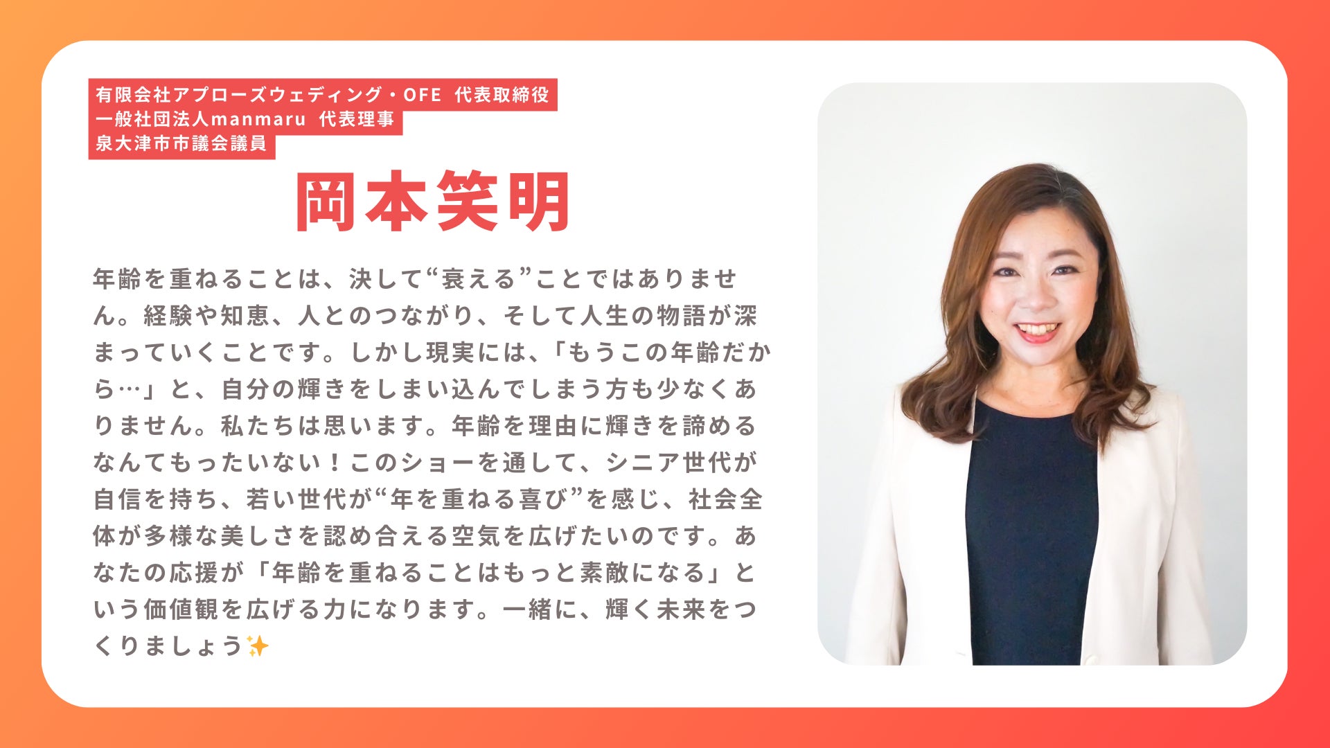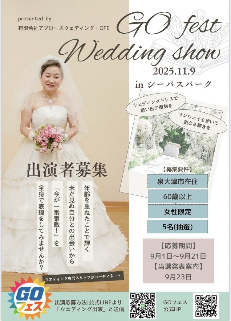 (有)アプローズウェディング ・OFE 岡本笑明(えみ)氏プロデュース、シニア世代でも、誰もが自分らしく輝くウェディングショー。シニア世代のモデルが、年齢に関係なく、それぞれの人生と個性を全身で表現します。「今がいちばん素敵!」を感じられる心温まるファッションショーです。