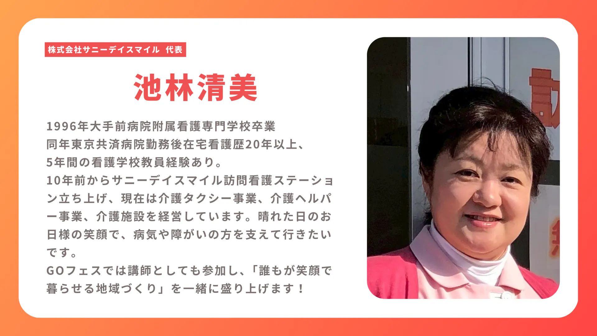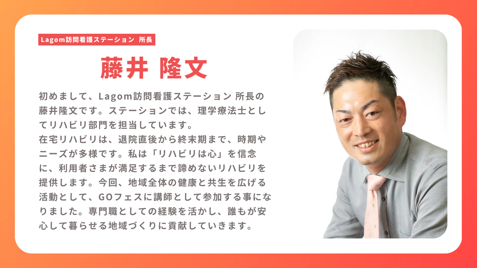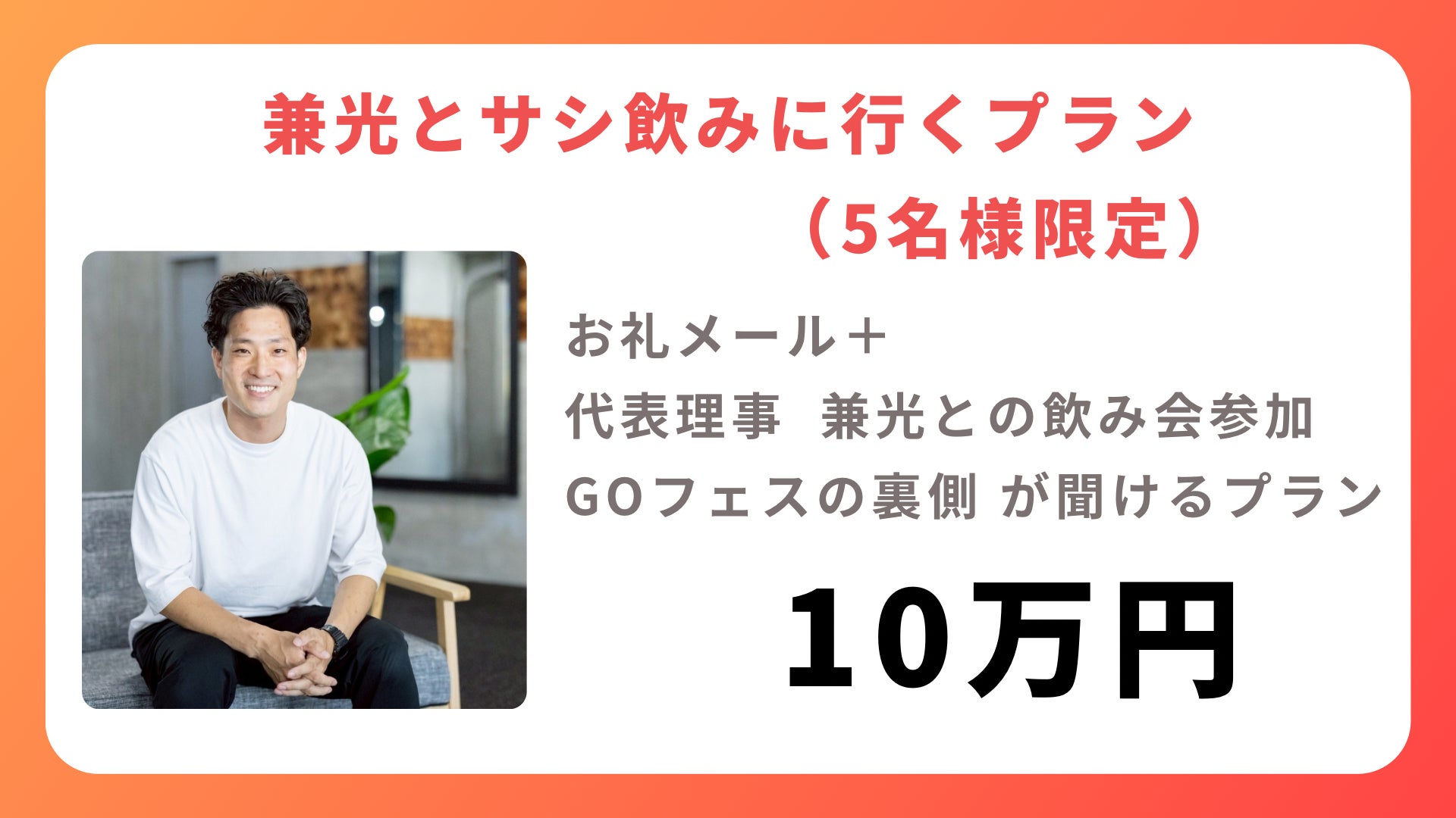 こんにちは、代表理事の兼光です。GOフェスは子供からシニア障害のある方など「みんながワクワクする社会を創る」ために今年に医療・介護・福祉に関わる方や障害当事者の方を交えて一般社団法人GOフェスを結成し、GOフェス開催に向けて動き始めました!