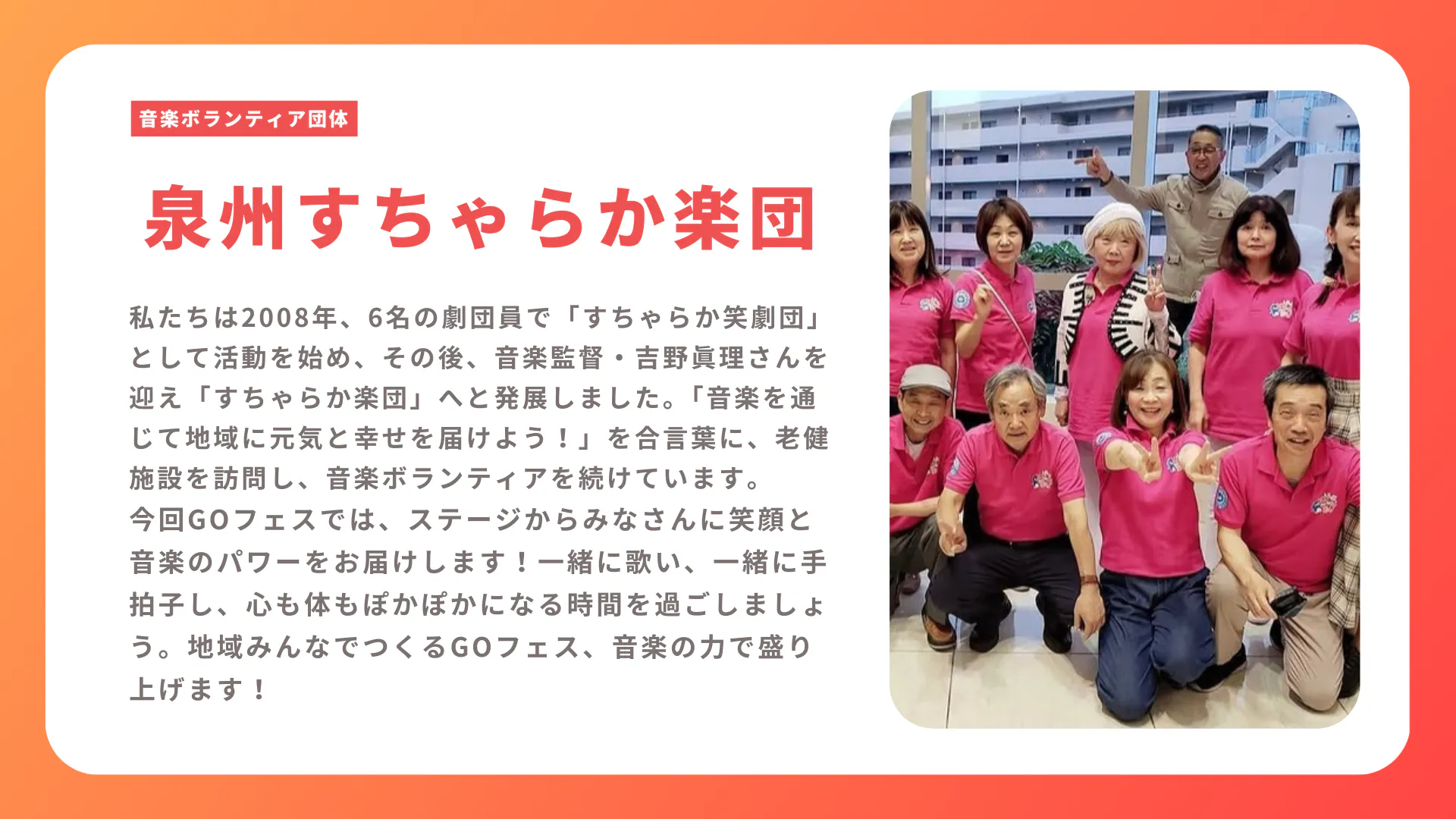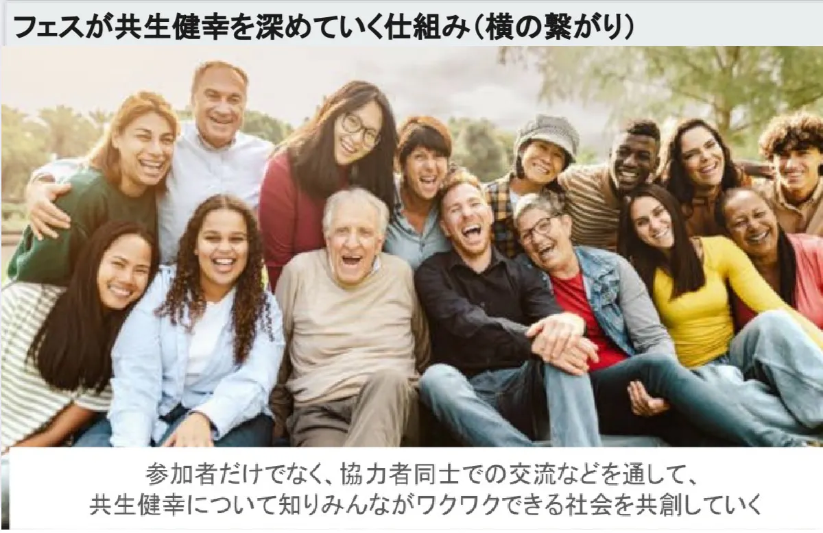 音楽、ファッション、アート、そして、様々な健康で幸せな共生社会につながるイベントを通じて、多様な人々が対等に出会い、地域や世代を超えたつながりを生み出すことを目的とした GO フェスを開催することとなりました。また、GO フェスでは、認知症理解や災害時支援、障害者への合理的配慮など、誰もが生きやすい地域づくりの課題についても、楽しく学べる機会とします。医療・障害者福祉・高齢者福祉の連携を軸に、「誰もが主役になれる場」を地域に実現することで、人と人との関係性が“福祉”だけではなく“地域の文化”として支え合える共生社会を実現し、その文化を全国へ発信していきます。