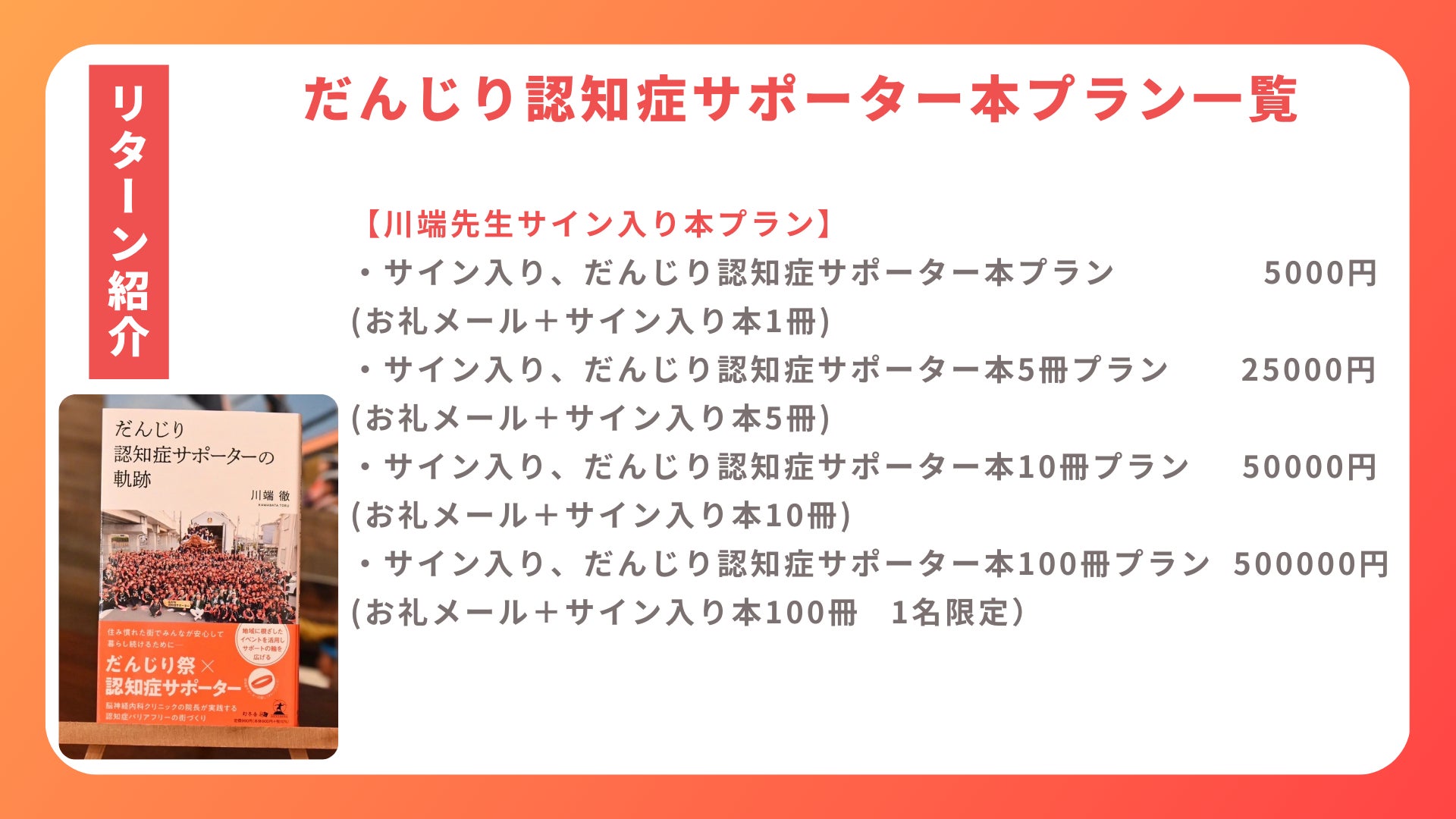 ※物品ありのリターン、割引券リターンにつきましては、GOフェスでは参加型のフェスを大切にしている事から、当日現地にてお渡しのみとさせていただきます。なお、だんじり認知症サポーター川端先生サイン入り本プランにつきましては、5冊以上は発送相談させていただきます。