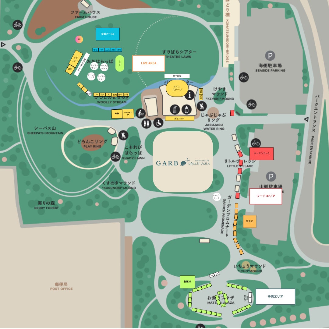・起伏のある公園ですが、車いすの方も多く来場されている公演です。大き目の車椅子トイレが1カ所、小さ目のものが2カ所あります。サポートが必要な場合は、お近くのスタッフにお声掛けください。