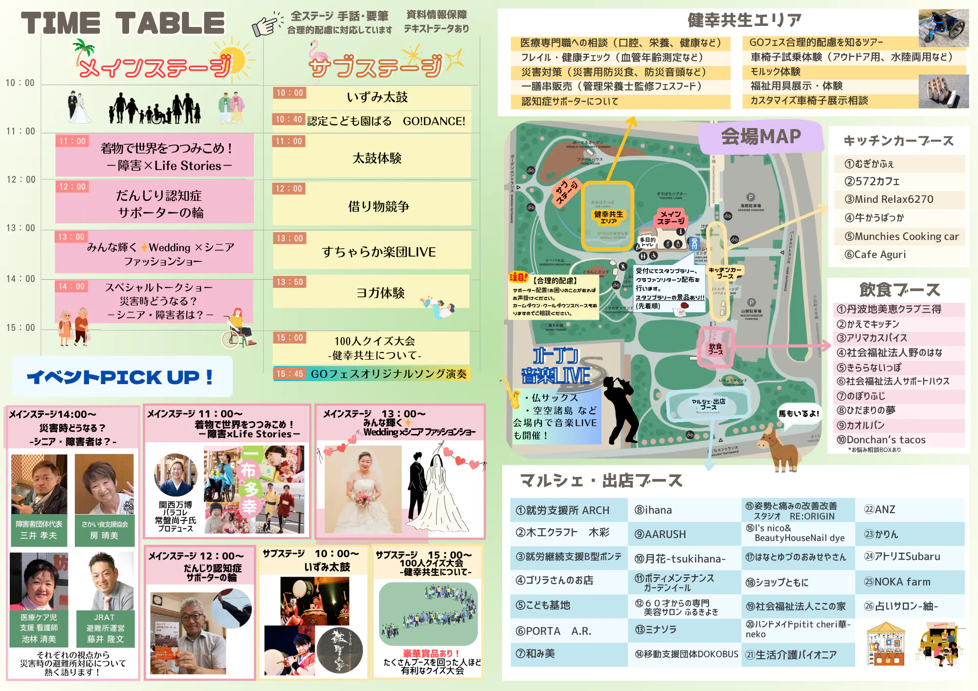 ・情報保障として、メインステージ、サブステージには全体手話通訳、全体要約筆記通訳を配置しております。各店舗に筆談ボードを用意しております。視覚障害のある方へのテキストデータの送信もさせていただきます。