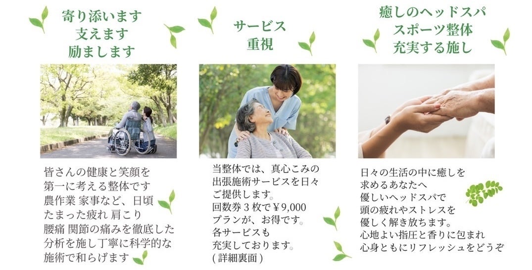 - 高齢者の身体の不調や痛みの緩和を目的とした整体施術
