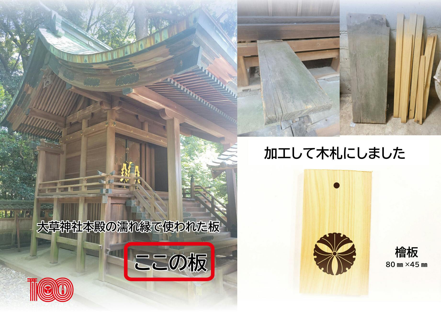 また現在修復中の大草神社本殿に使用していた濡れ縁の桧を加工した木札も返礼品として用意しております。
