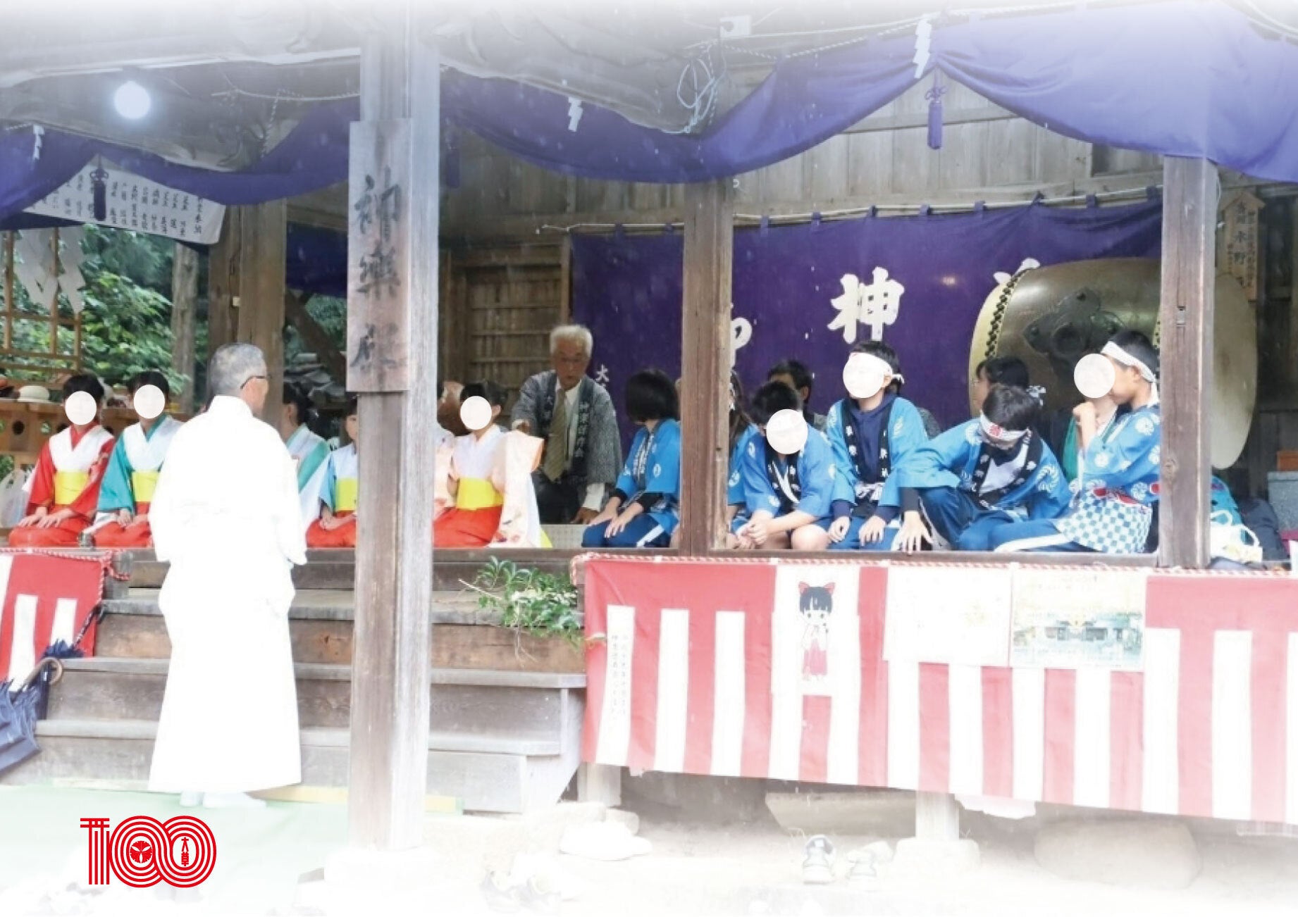 100年前の遷座を機に始まり、今年で100年を迎える神楽舞。地元の小学生が「神楽保存会」の指導を受け、笛や太鼓の音色にあわせて舞を奉納します。地域の宝ともいえる姿を、これからも残していきたいと願っています。