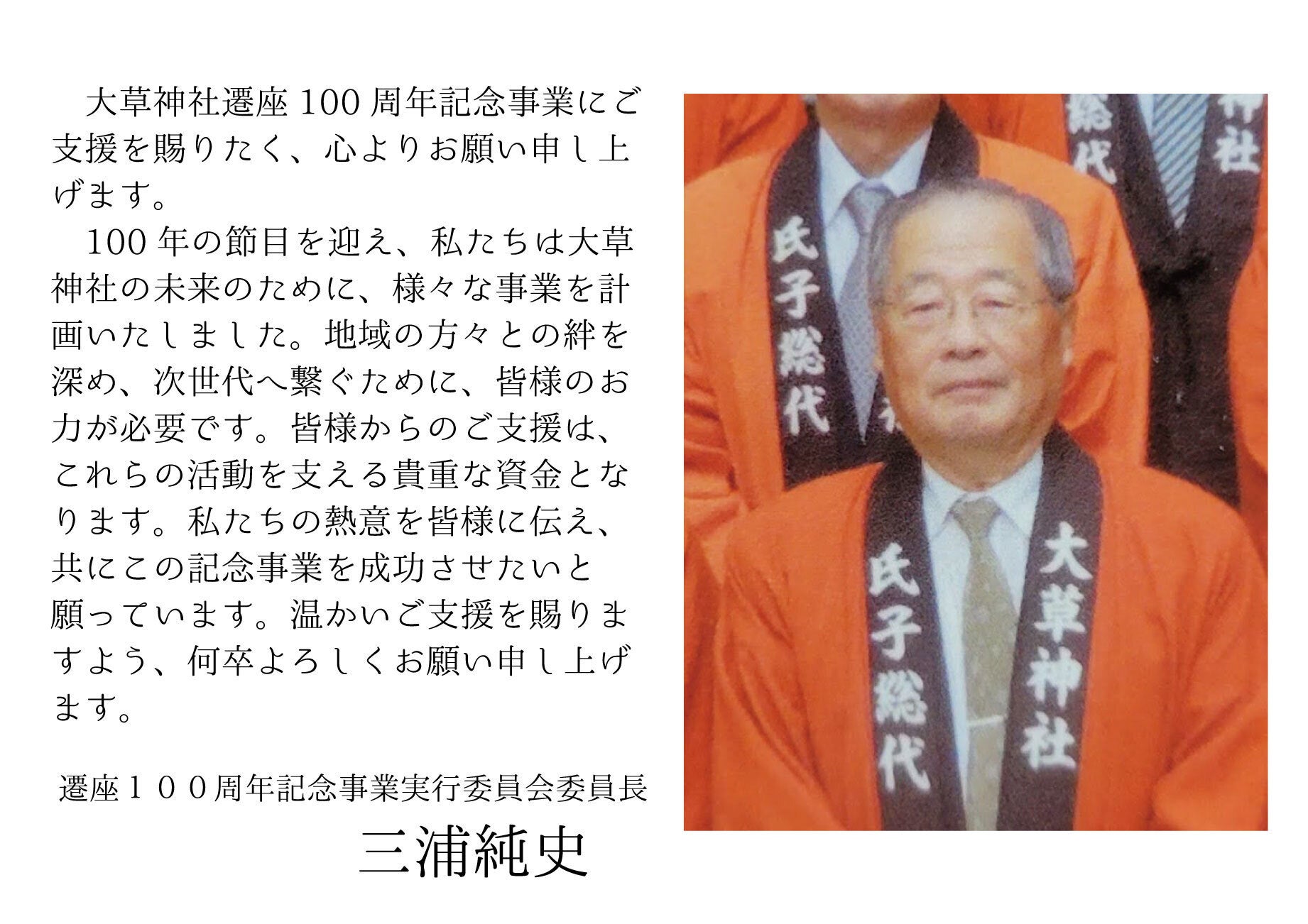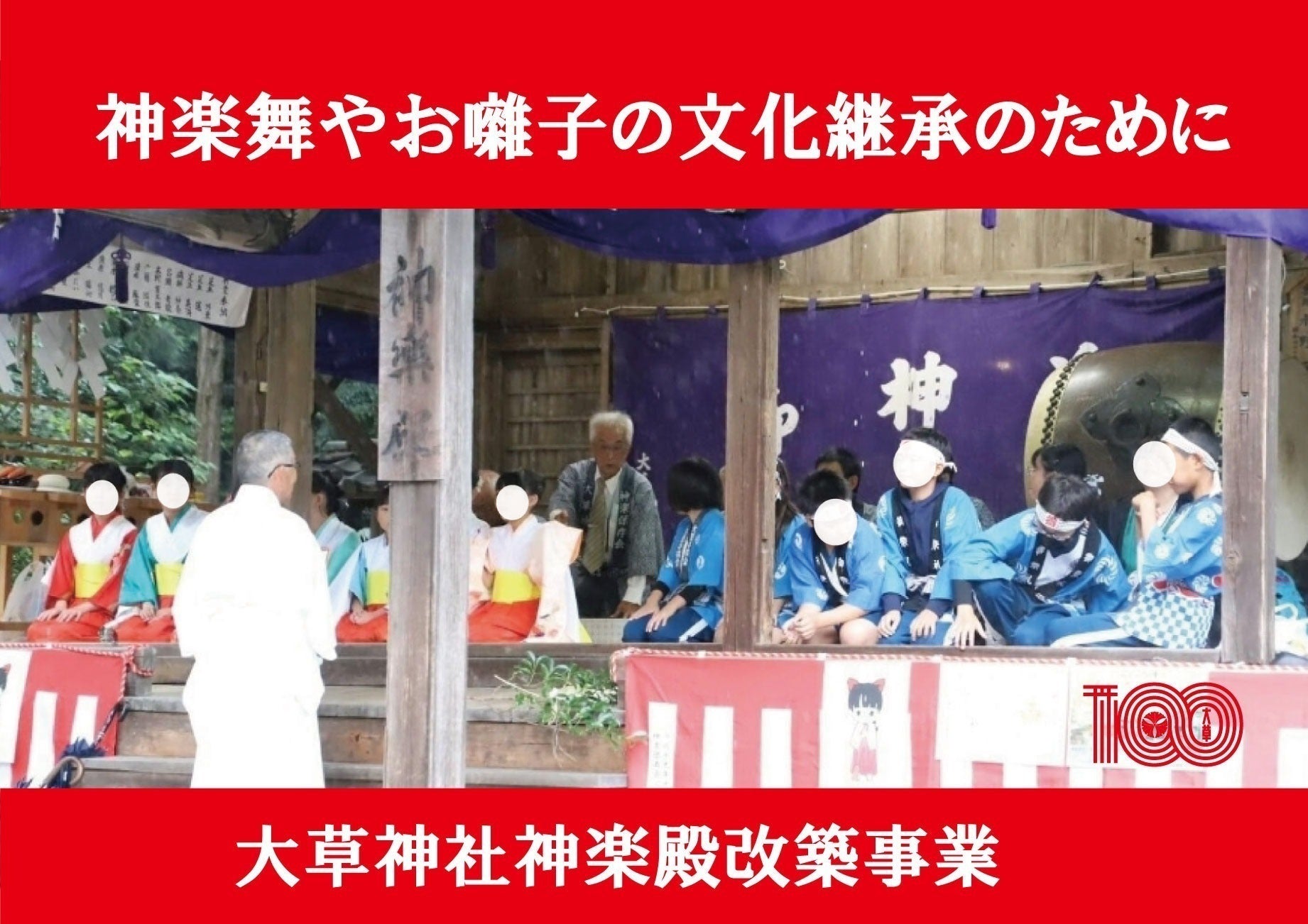 私たち「大草神社遷座100周年実行委員会」は、この大事業を必ず成し遂げるため、クラウドファンディングでの資金募集に取り組むことを決意いたしました。どうか本事業の趣旨をご理解いただき、あたたかいご支援を賜りますようお願い申し上げます。