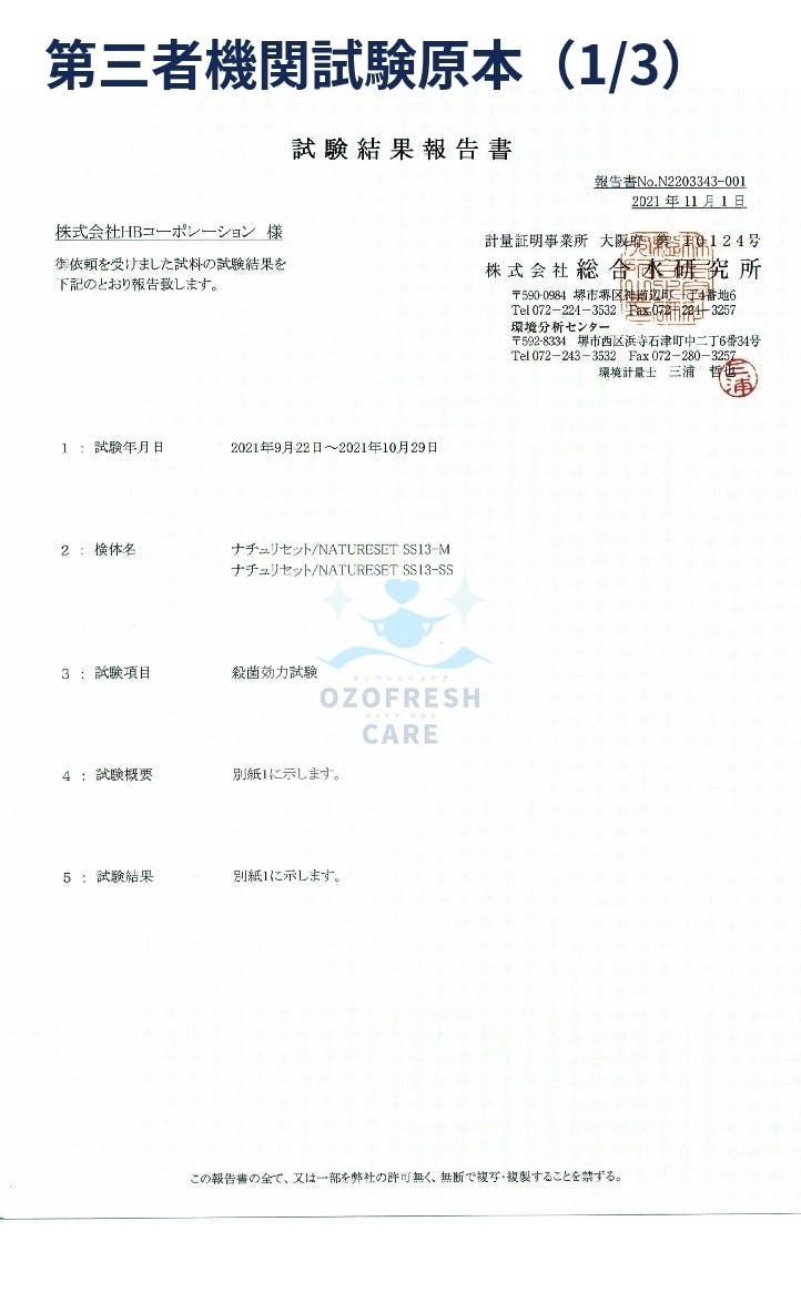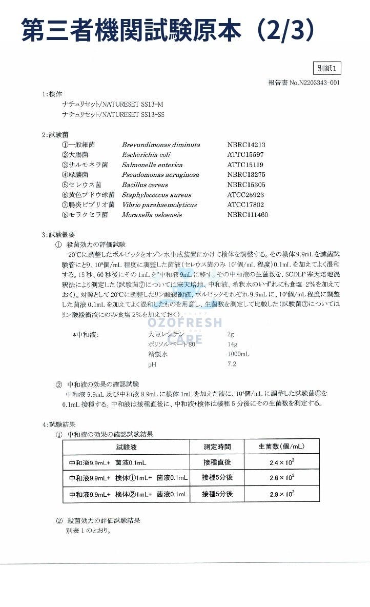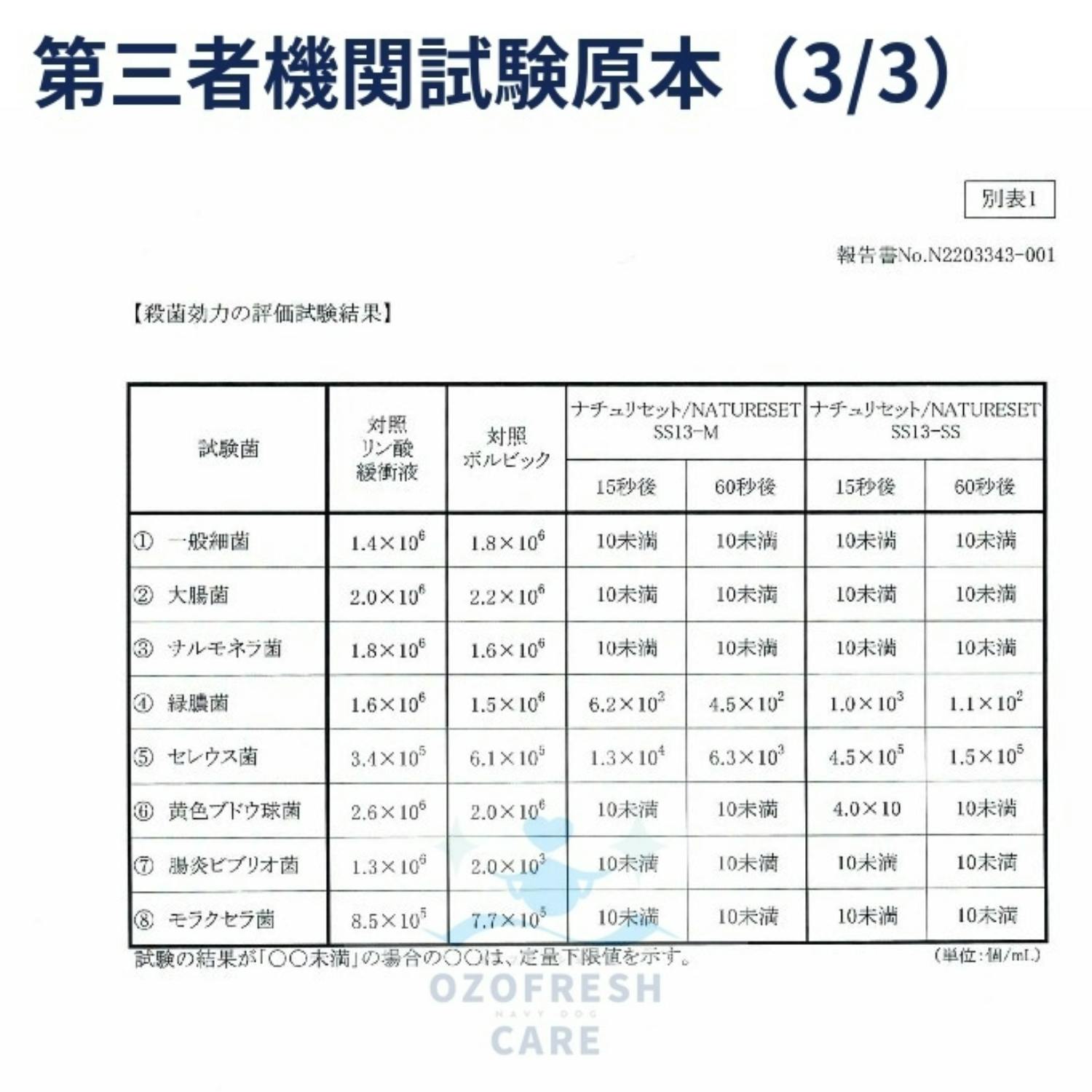 OZOFRESH CARE(NATURESETシリーズ)は、外部の第三者試験機関による正式な殺菌効力試験を受け複数のエビデンスがあります。