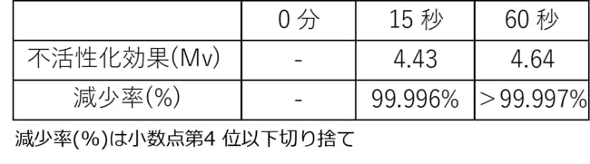 結果は、15秒後に99.996%減少、60秒後に99.997%減少となり、ウイルスが減少したことが確認された。