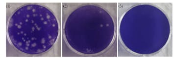 プラーク法による感染価測定例(1:コントロール、2:15秒後、3:60秒後)