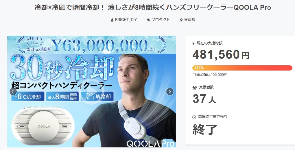 2025/10/02 00:58ご支援者様、冷却×冷風で瞬間冷却! 涼しさが8時間続くハンズフリークーラーQOOLA Proにご興味をお持ちいただきありがとうございます。プロジェクト開始から40日目で37人ものご支援者の方々より支援頂き、無事プロジェクト終了を迎えることが出来ました。早速皆様のリターンを2025年10月末にお届けできるよう準備を始めております!皆様にご満足いただけるリターンをお届けできるよう、全力で取り組んで参りますので引き続き、「冷却×冷風で瞬間冷却! 涼しさが8時間続くハンズフリークーラーQOOLA Pro」をよろしくお願い致します。BRIGHTチーム もっと見る