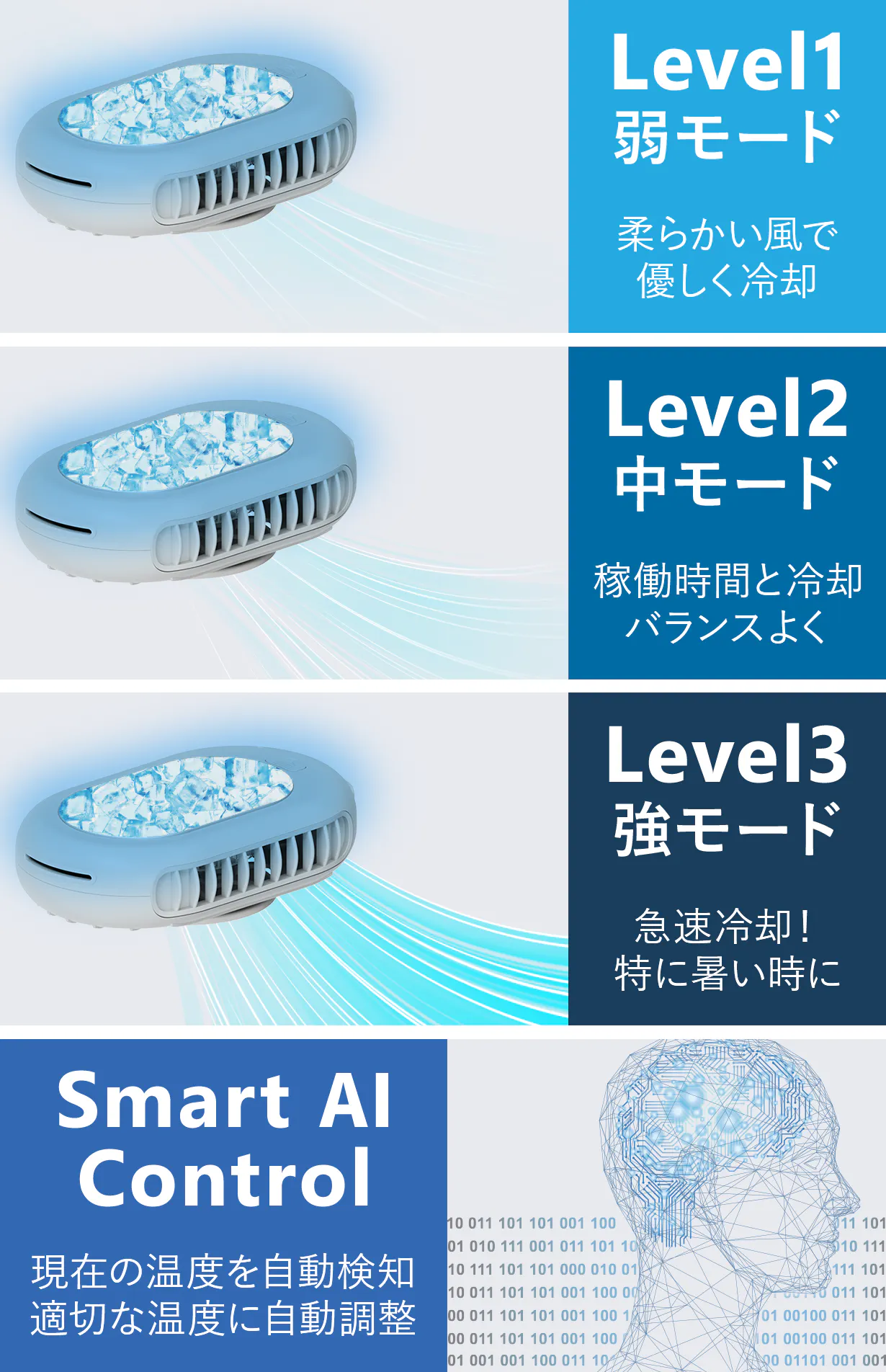 Smartモード※をオンにすれば、AIが現在の温度を自動検知し、最適な冷却レベルに自動調整します!