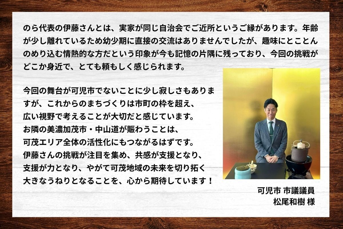 2025/11/13 17:06オープン延期のお詫びとお知らせいつも温かいご支援と応援を、本当にありがとうございます!皆様のおかげで、中山道太田宿のプロジェクトは日々着実に進んでいるのですが、ここで大切なお知らせと、心からのお詫びがあります。オープンは2026年1月下旬になります当初、2025年11月に「酒・おでん・肴 のら」開業を目指して準備を進めていましたが、オープンを2026年1月下旬に延期させていただくことになりました。オープンを楽しみにしてくださっていた皆様、大変申し訳ありません!延期の理由としましては、中山道太田宿という歴史ある街で建物の取得や各種許認可を進めるにあたり、予想以上に専門的な課題が多く、その解決に時間を要してしまいました。歴史を大切にする場所だからこその難しさに直面し、時間がかかってしまいましたが、無事にこのハードルを乗り越えることができました!ご心配をおかけしますが、どうかご理解いただけると嬉しいです。でも、嬉しいお知らせもあります!店舗がさらにパワーアップ!この準備期間を活用し、「酒・おでん・肴 のら」が、企業の皆様のご協力により、さらに素敵な場所になることが決定しました!なんと、居酒屋「のら」に加えて、民泊とサウナ(予定)を併設した複合施設としてスタートします!これにより、皆様が「のら」で美味しいお酒や食事を楽しむだけでなく、宿泊やリフレッシュ(サウナ)まで、太田宿の魅力をまるごとゆっくり満喫できると確信しています。正式なオープン日が確定しましたら、改めてワクワクする詳細とともにお知らせしますので、もう少しだけお待ちいただけますようお願いいたします。ご報告が遅れたこと、そしてオープンが遅れてしまったこと、重ねてお詫び申し上げます。引き続き、「のら」の挑戦を温かく見守り、ご指導いただけると大変心強いです。これからもどうぞよろしくお願いいたします!「酒・おでん・肴 のら」店主 伊藤 秀信 もっと見る