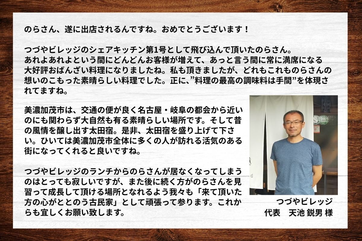 そんな時、美濃加茂市の姫biz(ひめびず)さんに相談に行ったところ、美濃加茂市三和町にある、サウナ古民家宿つづやビレッジさんがシェアキッチンを募集していることを教えてもらいました。物件を探している間だけ、試しにランチ営業に応募してみることにしたんです。 少しでも自分の作ってきた料理を披露して、喜んでいただけたら嬉しいな、という想いで期間限定で「間借りで食堂のら」をオープンさせていただきました。