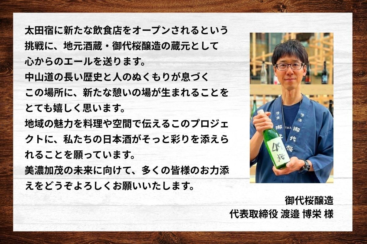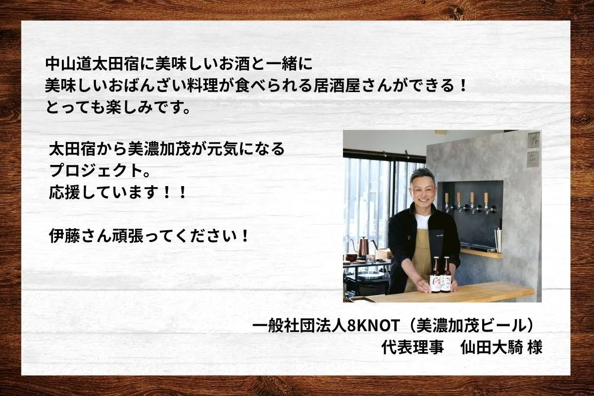 どうしても居酒屋をやるなら、中山道太田宿しかない!と決めて、場所を探していました。正直なところ、今の太田宿は、昔ほどの活気はないんですが…、少しでも古い街並みを守って、太田宿を盛り上げるために、今まで料理人として、音楽イベントのオーガナイザーとして培ってきた経験を活かして、起爆剤になれたら!と思っています。