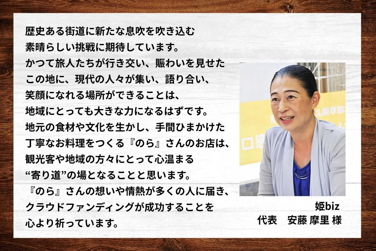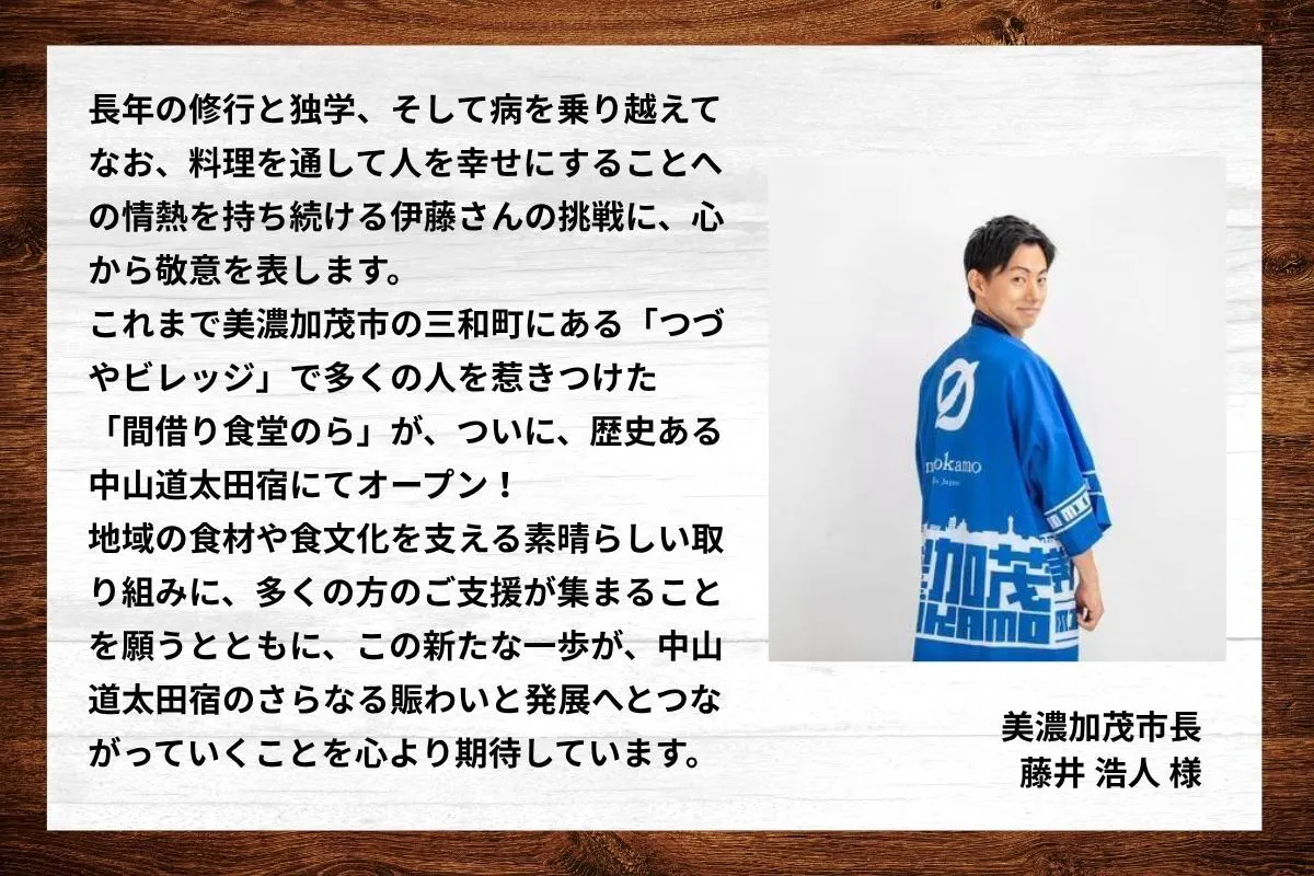 そこで、少しでも昔の建物を残し街並みを保全しながら活気ある太田宿を戻し、多くの方に知っていただく、ためにも自分が、起爆剤となり活気あるれる中山道太田宿のために何とかか、地域貢献できないのかと自分の得意な料理や音楽イベント培ったノウハウを活かしたいと言う思いが強くなりました。