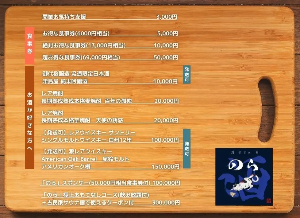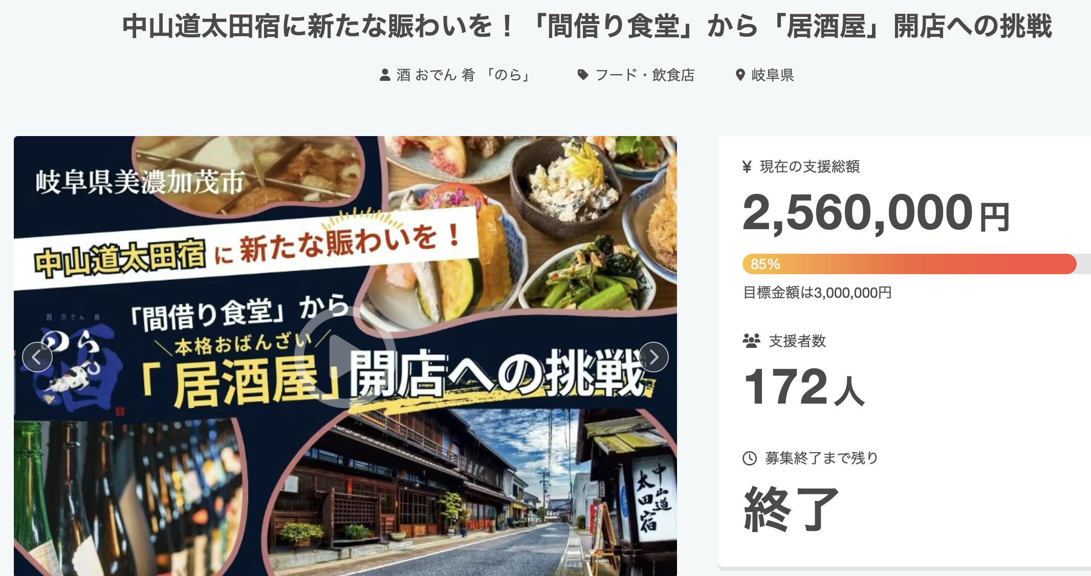 2025/09/01 10:25この度はクラウドファンディングにて、1ヶ月で172名様から2.560.000円ものご支援をいただくことができました。本当にありがとうございました!当初の目標額よりも少し足りませんでしたが、皆様の有難い気持ちのこもったご支援のお陰でこの様な沢山の金額を受け取る事ができますことを本当に有難く感謝の気持ちしかありません。どうしても居酒屋をやるなら、中山道太田宿しかない!と決めて、場所を探していました。正直なところ、今の太田宿は、昔ほどの活気はないんですが…、少しでも古い街並みを守って、太田宿を盛り上げるために、今まで料理人として、音楽イベントのオーガナイザーとして培ってきた経験を活かして、起爆剤になれたら!そして、一人でも多くのお客様に喜んでいただける料理を提供して、「のら」のファンになっていただけるように、なんとか今回の実店舗での営業を成功させたといった気持ちが伝わった結果、クラウドファンディングにご支援いただけたと思っております。今後は、皆様からご支援していただいたお金と気持ちを無駄にしないよう、お店の開業資金に充てさせていただきます。11月開業を目指して邁進して参りますので今後もご支援、ご指導よろしくお願いします。ご支援頂いた各、リターンは10月から順次発送いたします。 リターンについてご質問等ございましたら、何なりとDMやお電話ください。尚、リターンに有ります優先予約の方法はインスタグラムと支援者メッセージにて開業日が、決まりましたらお知らせ致しますのでよろしくお願いします。のらのインスタグラムはこちらhttps://www.instagram.com/nora_sake/この度は誠にありがとうございました。皆様と笑顔で乾杯できる日を、心から願っています。酒·おでん·肴 のら 店主 伊藤 秀信 もっと見る