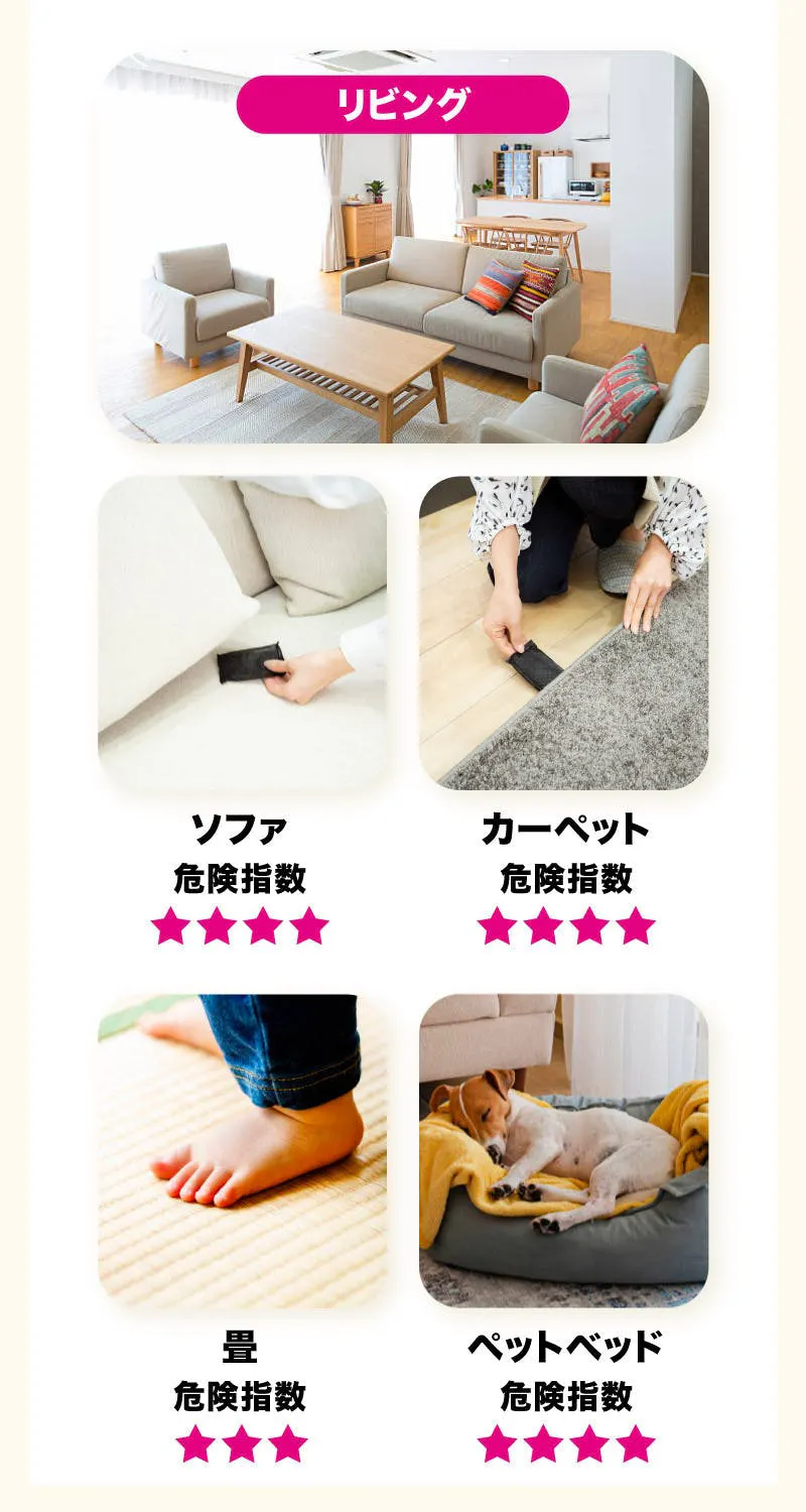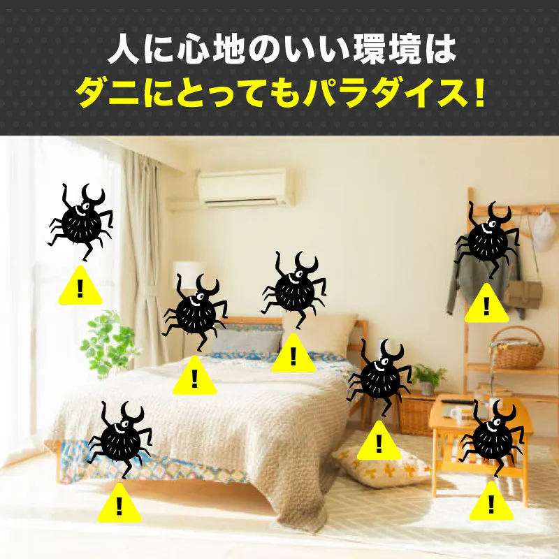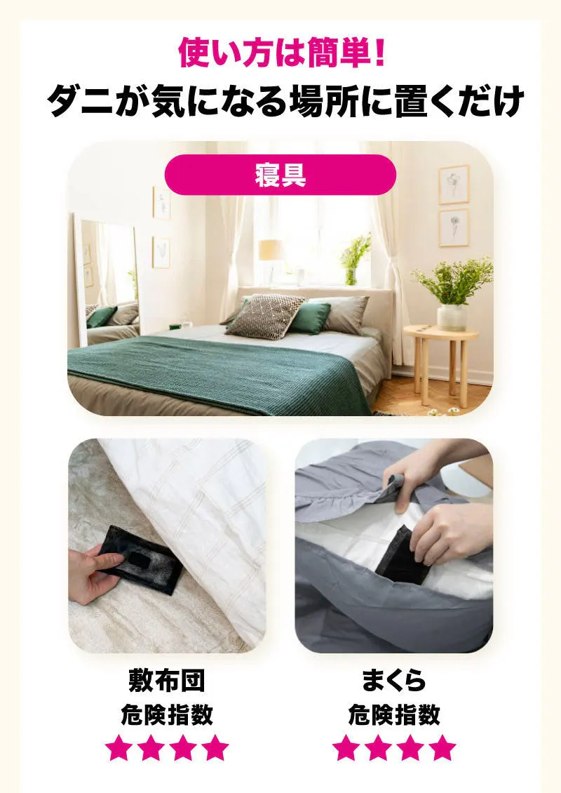 布団や枕だけでなく、カーペットやソファ、クローゼットの中など布物が多い場所には複数使用するのがおすすめ。