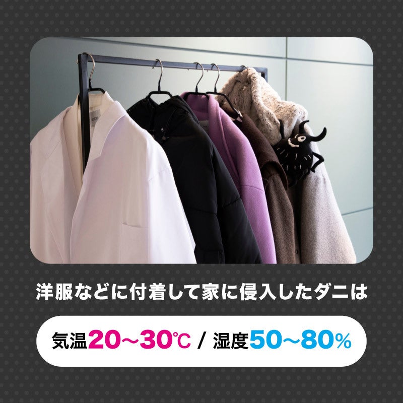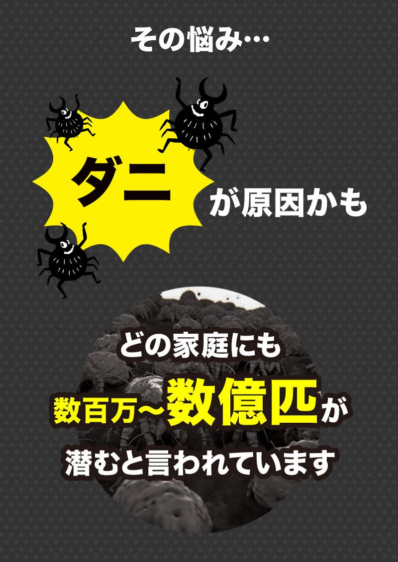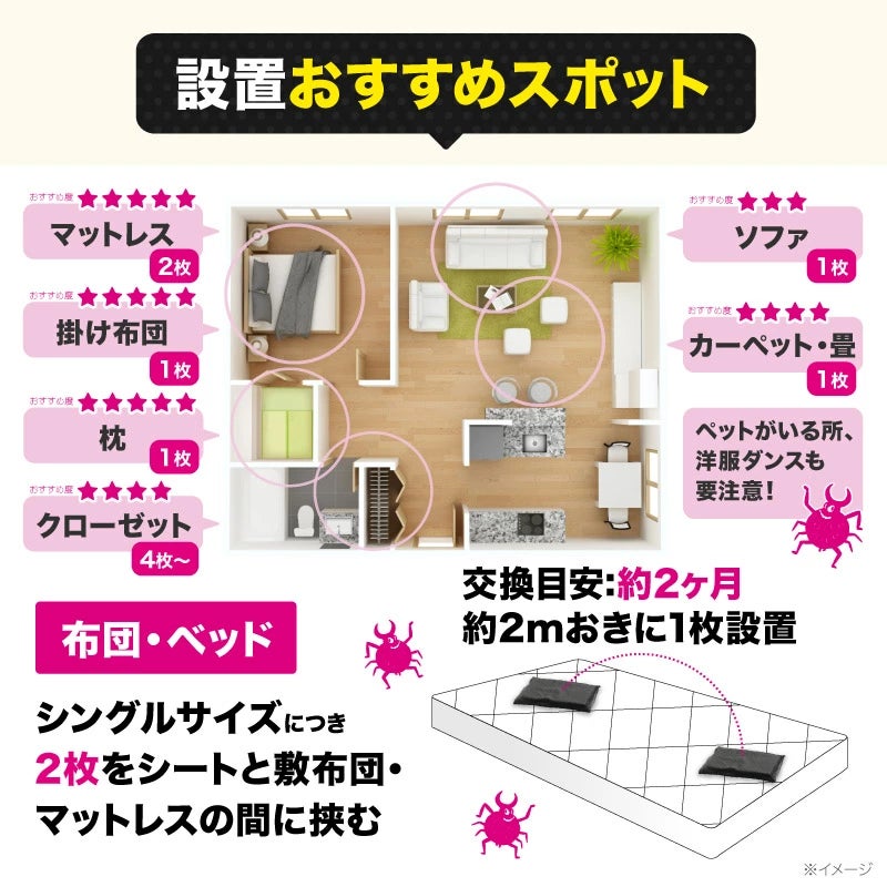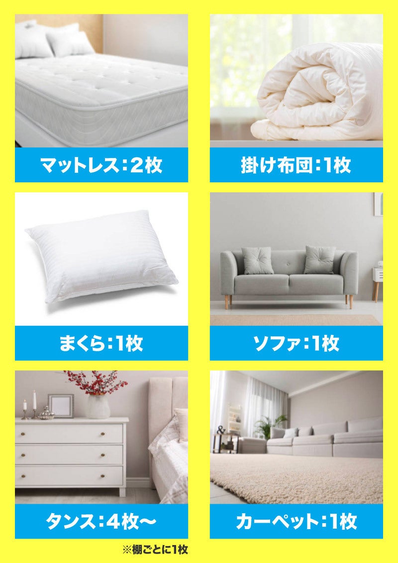 布団や枕だけでなく、カーペットやソファ、クローゼットの中など布物が多い場所には複数使用するのがおすすめ。