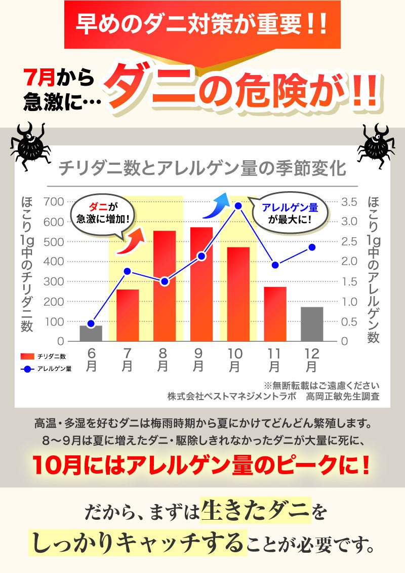 ダニが大量発生している今のうちに生きたダニをしっかりキャッチすることが大事です!