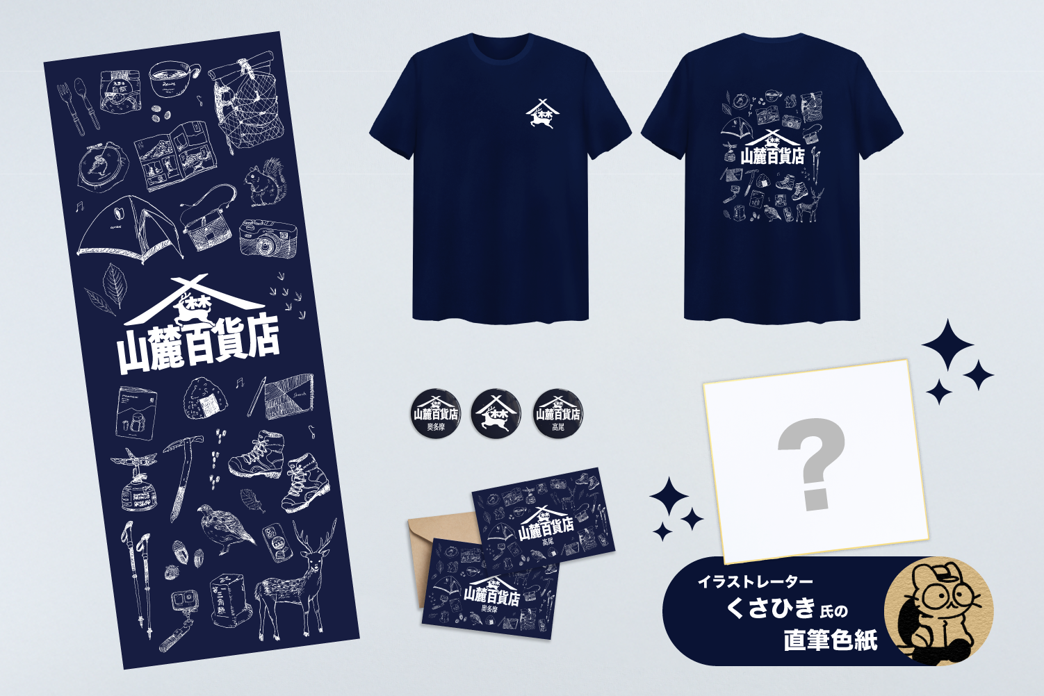 参加クリエイターによる追加リターンが登場です!新潟を拠点に活動し、山登りを題材にした漫画やイラストを制作するくさひき氏直筆色紙と、山麓百貨店公式のメッセージポストカード2種、缶バッチ、手ぬぐい、Tシャツのセットをお届けします!