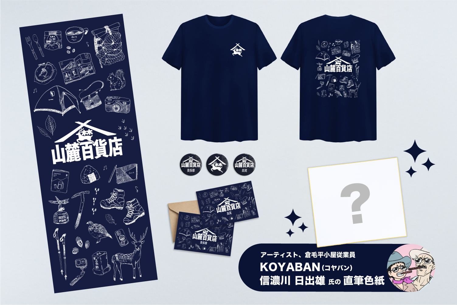 参加クリエイターによる追加リターン第二弾が登場です!マンガ「山と食欲と私(新潮社)」の作者信濃川日出雄氏直筆色紙と、山麓百貨店公式のメッセージポストカード2種、缶バッチ、手ぬぐい、Tシャツのセットをお届けします!