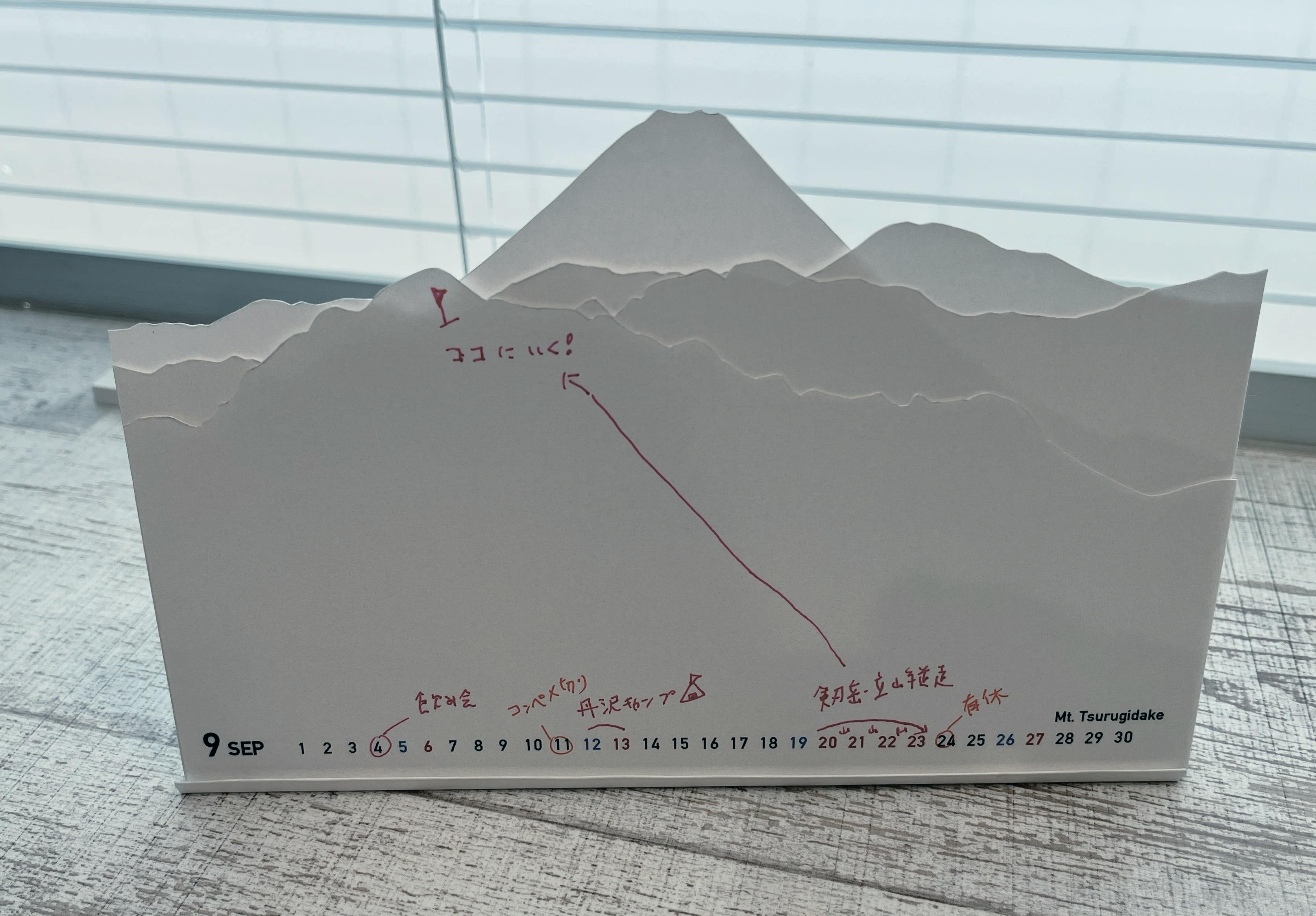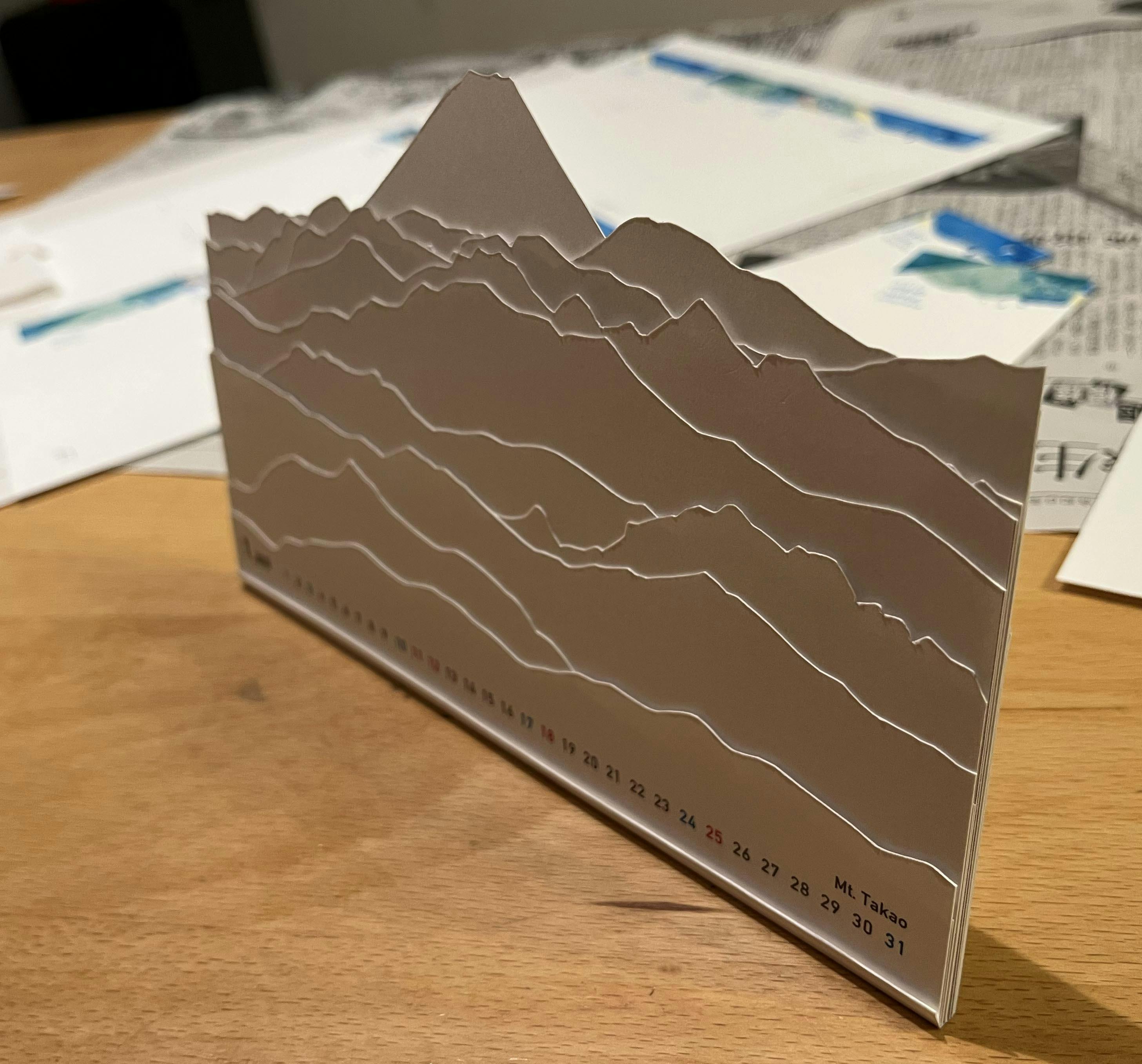 WILD MAPSさん渾身の新作は山の姿をモチーフにしたカレンダー。しかも、重ねることで連なる山々の感じがたまらなくいい!現在、奥多摩と高尾の両会場でお披露目するために、試作を重ねているそうです。