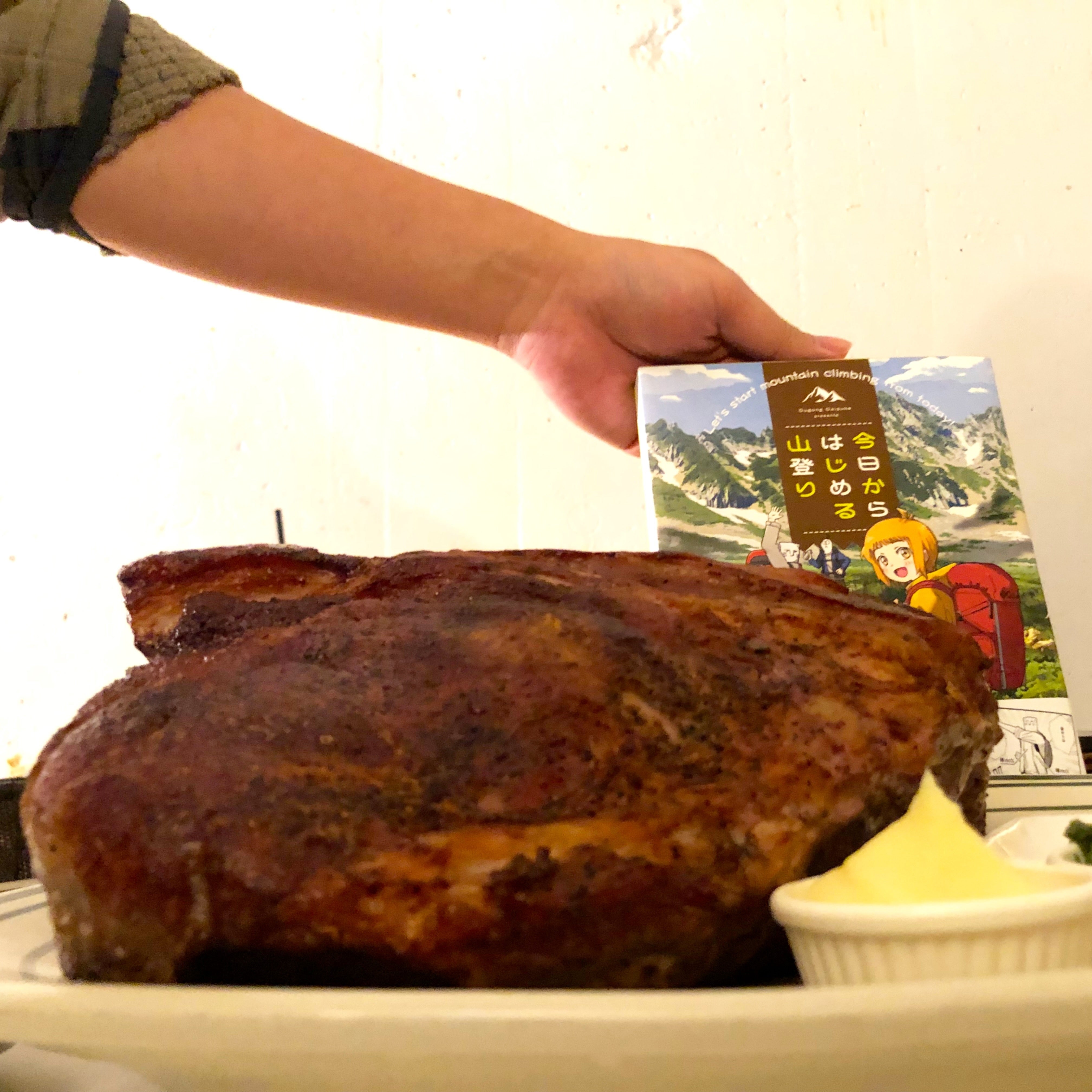 オリンポス級の肉塊と「今日からはじめる山登り」の書影。お肉もすごいですが、書籍内容の充実っぷりもものすごいです。高尾山エピソードもありますので注目ですよ!