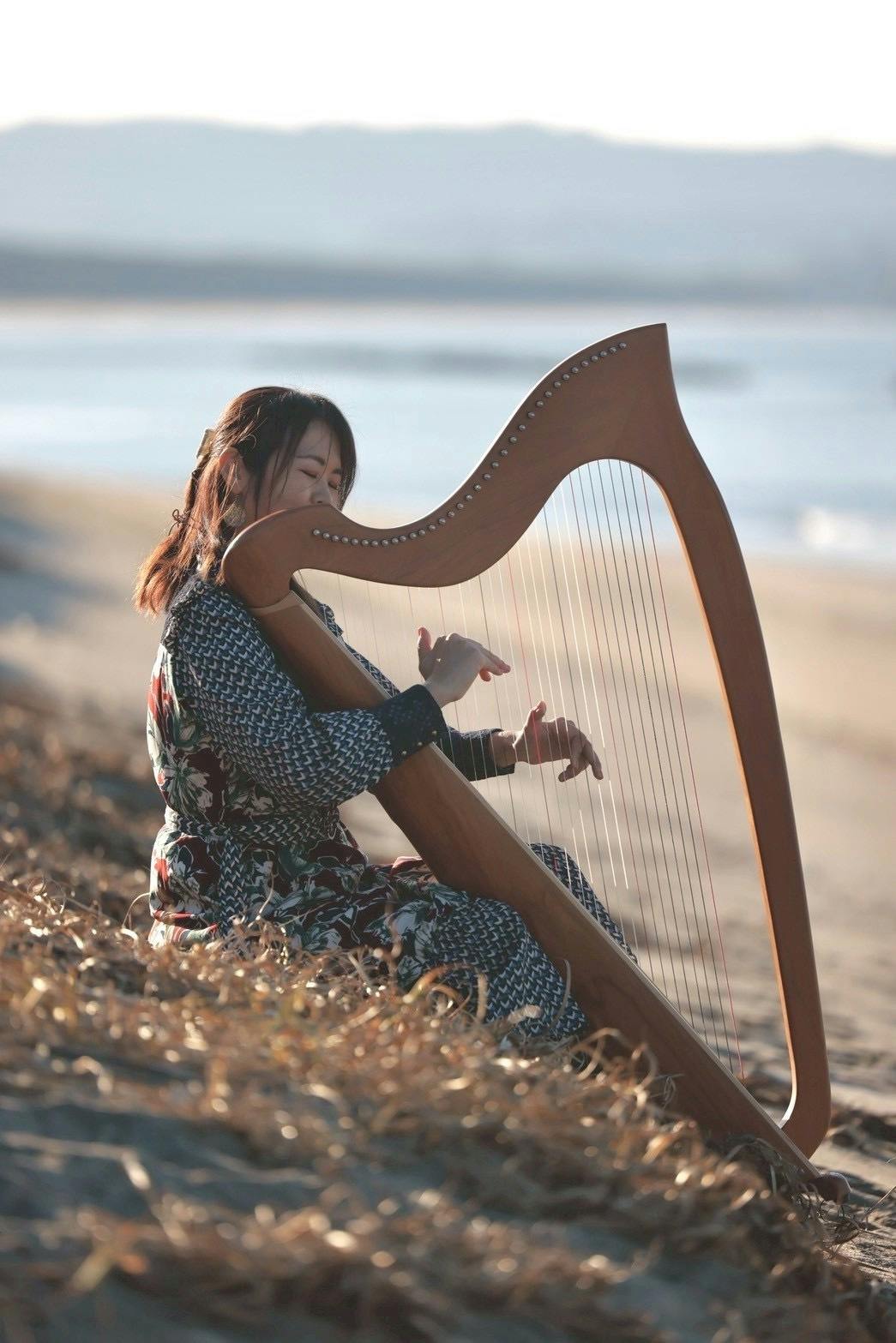 音色だけではなく、その形までもが優美なアイリッシュハープを演奏する佐久間さん。