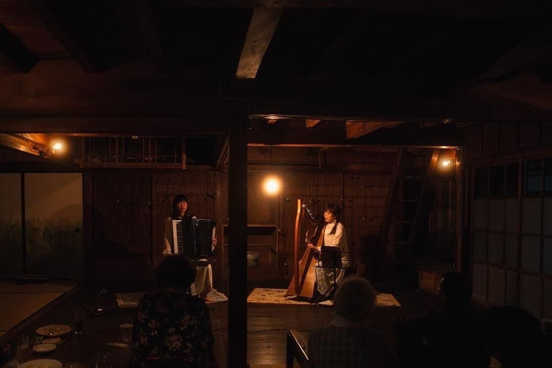 高尾会場であるTAKAO36HALLを運営するケルティック・ムーンさんに紹介していただいたStar Berylのおふたりは、アイリッシュハープ奏者の佐久間景子さんとアコーディオン奏者の吉岡美湖さんによるデュオ。これまで何度もおふたりで演奏していますが、なんとStar Berylという名前で演奏するのは今回が初お披露目とのことです。