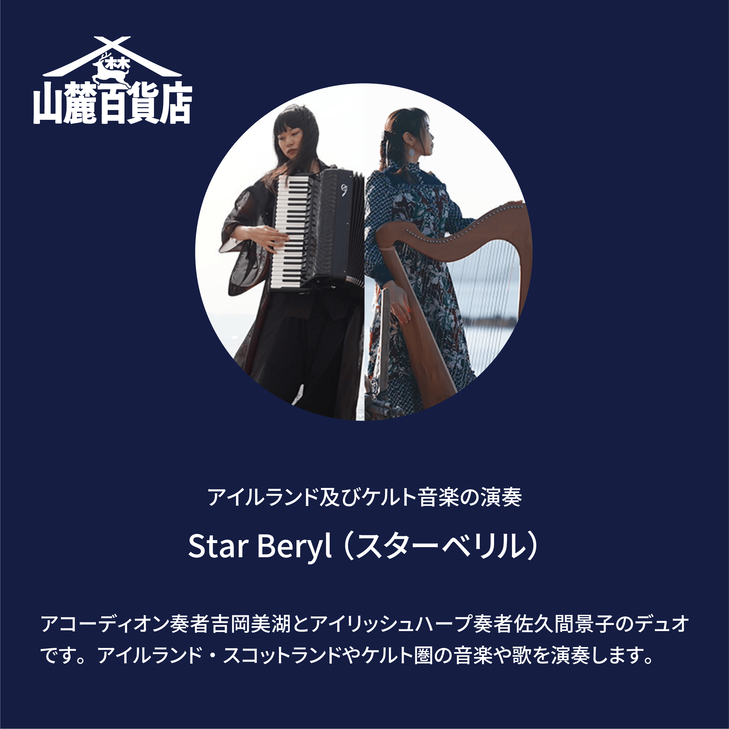 活動報告の一環として、山麓百貨店出店者の方々の情報をお伝えしていきたいと思います。今回はケルト音楽を演奏する、Star Beryl(スターベリル)さんをご紹介します。