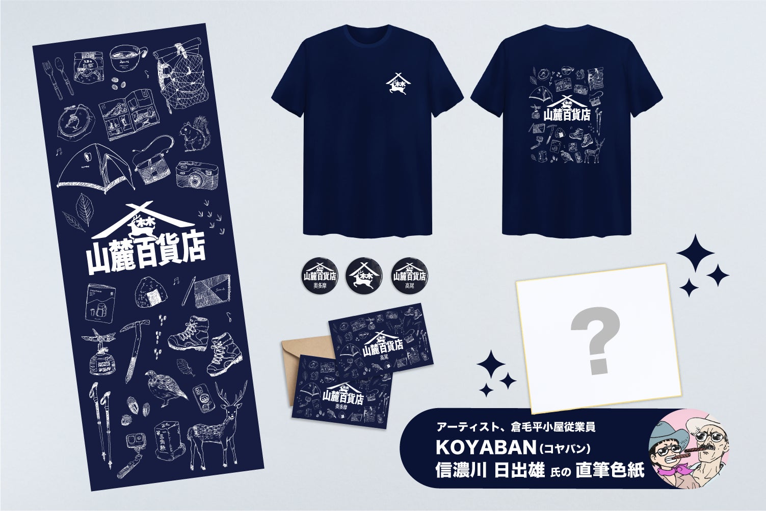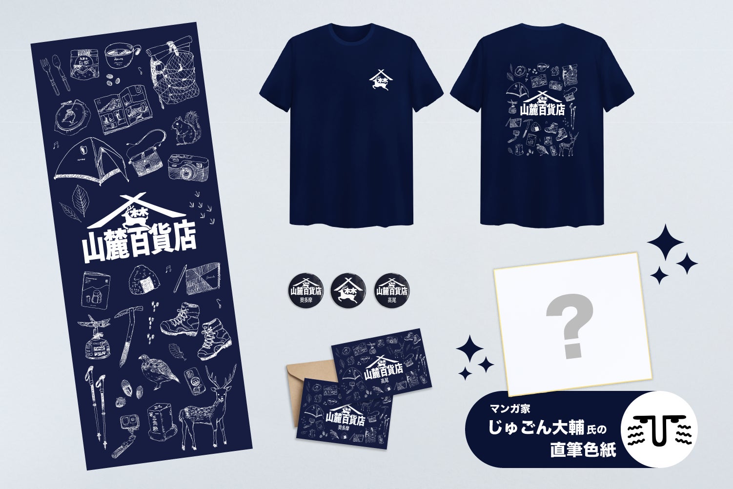 参加クリエイターによる追加リターンが登場です!コミックエッセイ「今日からはじめる山登り」(KADOKAWA)や「オタク登山道」(同人誌)の作者じゅごん大輔氏直筆色紙と、山麓百貨店公式のメッセージポストカード2種、缶バッチ、手ぬぐい、Tシャツのセットをお届けします!