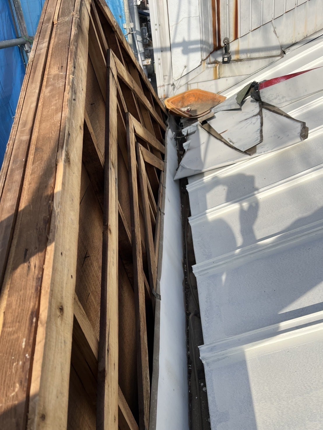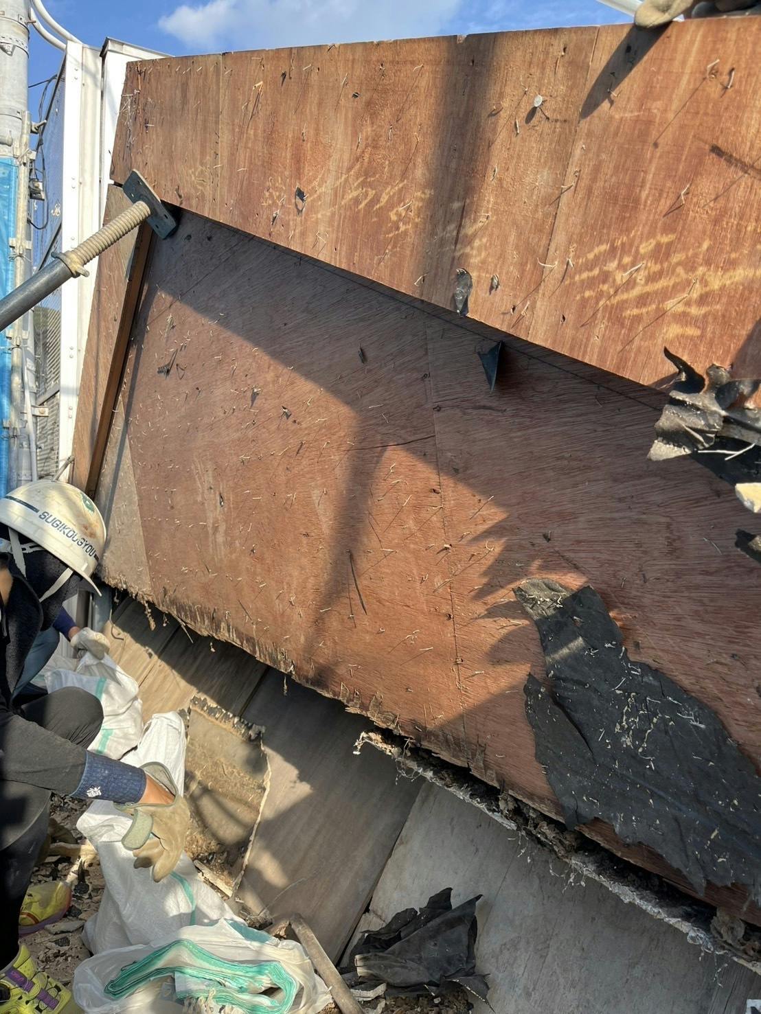 屋根の上に上がり、板金と外壁を剥がして