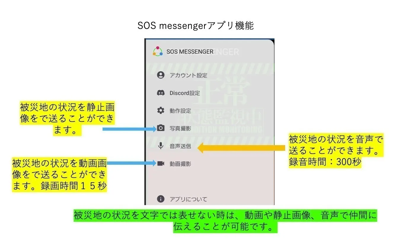 ・倒れてスマホが使いえない状況でもグループのスマホで被災地の音(声)が聞こえる。