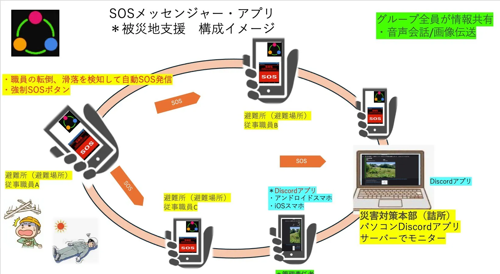 「一人の命も見逃さない」――倒れても声が出せなくても、音声・映像・位置情報でSOSを仲間に伝えるアプリ「SOS Messenger」を全国の福祉施設や作業現場に普及させることが本プロジェクトの目的です。