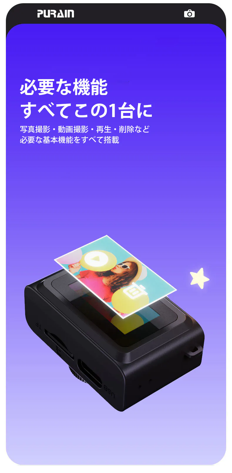 写真と動画の切り替えがボタンひとつで直感的にできる設計なので、複雑な操作は一切不要。撮りたい瞬間を逃さず、誰でも簡単に撮影を楽しめます。