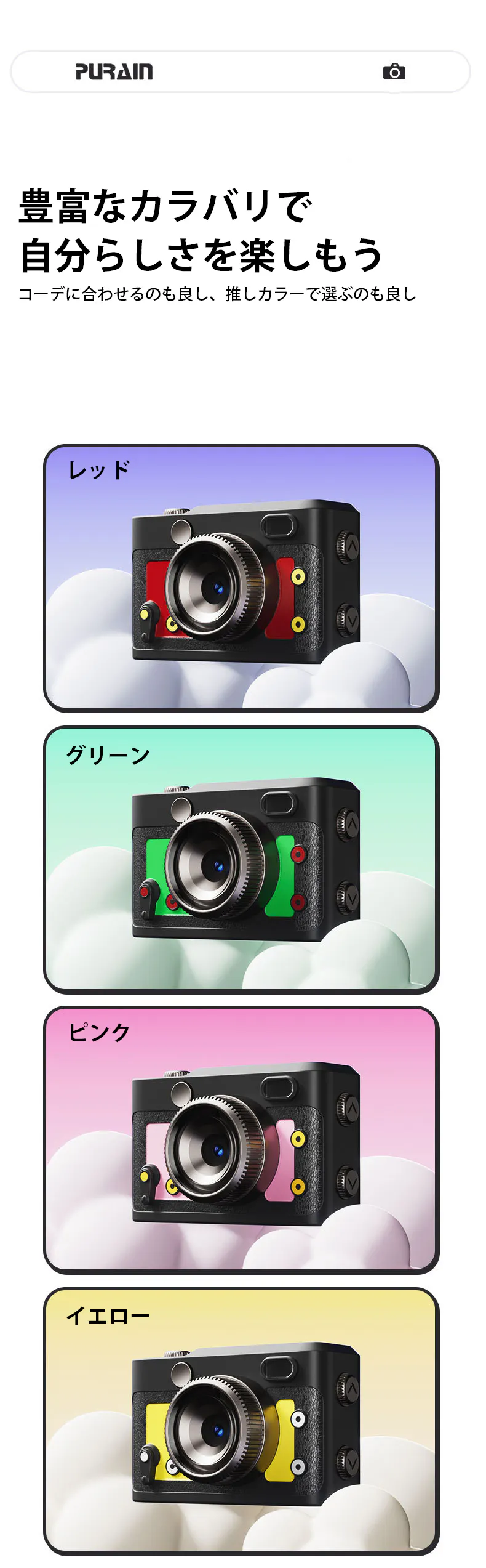 リストストラップ・ネックレス・キーホルダーとして身につけられる3WAY仕様。その日のファッションに合わせて“着るように”カメラを選べるから、どこへでも楽しく連れて行けます。
