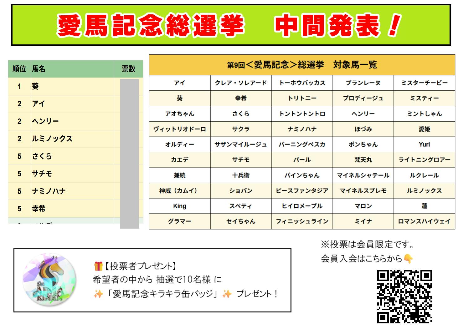 投票した希望者の中から抽選で 10名様 に、「愛馬記念キラキラ缶バッジ☆」 をプレゼント!☆