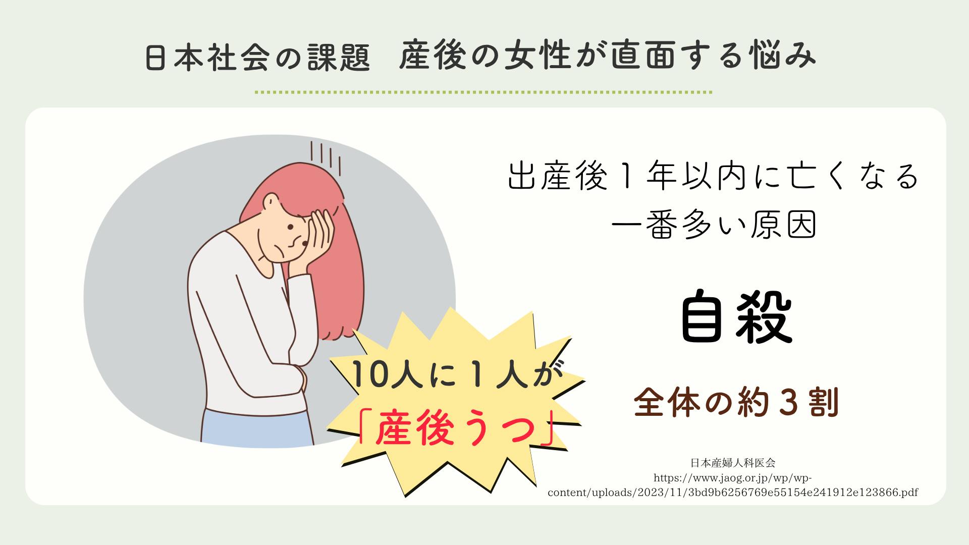 産後1年以内の産婦死亡の1位は悲しいことに自殺です。その背景に産後うつがあります。核家族化やサポート不足、地域の繋がりが希薄し孤独感を感じやすく、また慢性的な疲労や寝不足が重なりうつ状態になってしまいます。産後うつは誰でもなる可能性があり10人に1人がなると言われています。