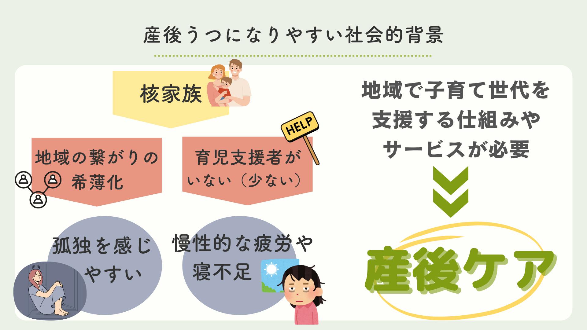 育児不安や子育ての孤立感、産後うつを抱える人を減らし地域の子育て世代をサポートする支援のひとつが産後ケアなのです。