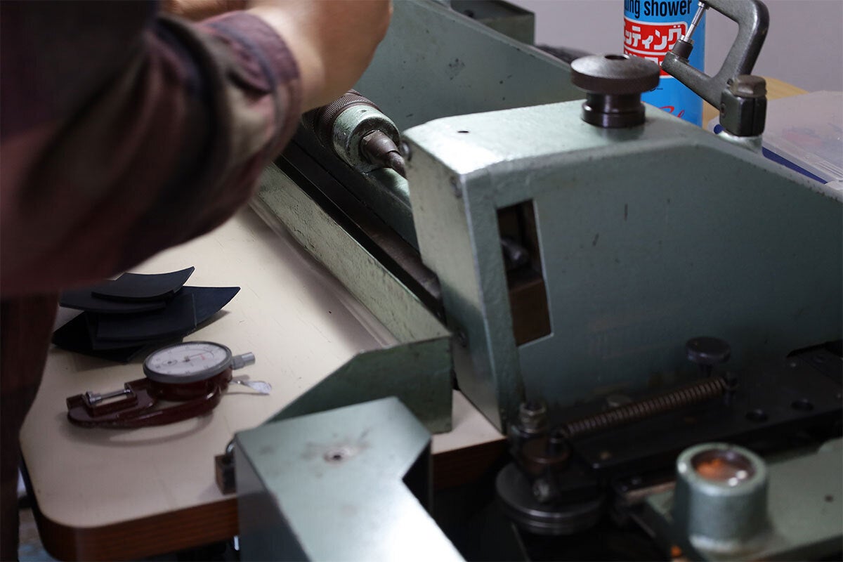 NP-350(ニッピ)は革の厚みを調節してくれる機械です。ミシン同様に40年前のものですが、きちんと調整され、精度は抜群。最薄0.3mm程まで革の加工ができ、私達のアイテムはこの機械がないと製作出来ないと言っても過言でないほど大切な存在です。インクは日本古来の群青色のような落ち着きのある青色です。所々に灰色や灰緑が現れます。こちらも控えめな光沢を魅せてくれるラメ入りと万年筆にも使用できるピュアインク(ラメなし)をご用意いたしました。