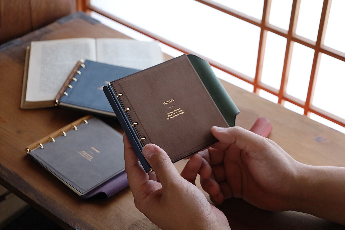 背表紙がバインダー金具になっているので、リフィルを交換したり気分に合わせて表紙を変えたり、バインダーの自由さとノートのような軽快さの嬉しい良いとこどりを実現しました。