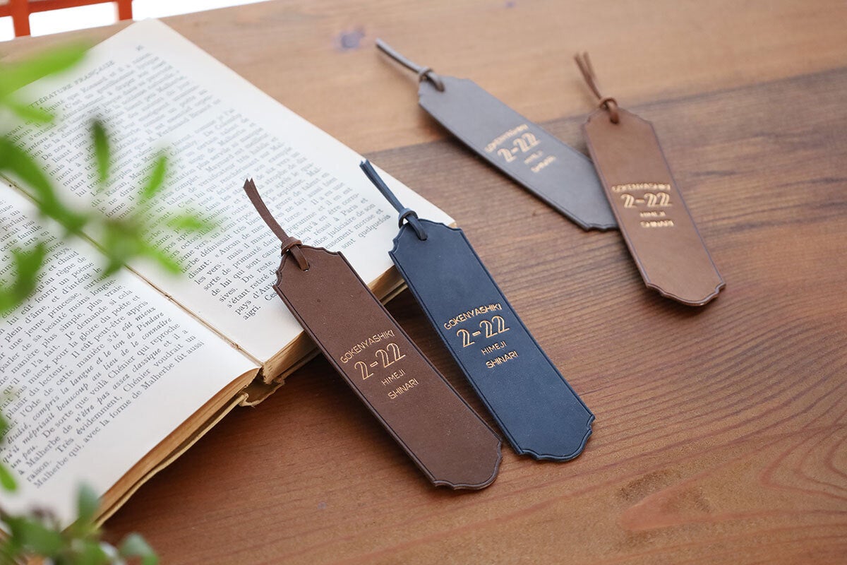 箔押しの文字は、アトリエ店舗の住所「姫路五軒邸2-22」。アトリエまでの行き方をさりげなく案内してくれます。読書好きの方には栞もございます。