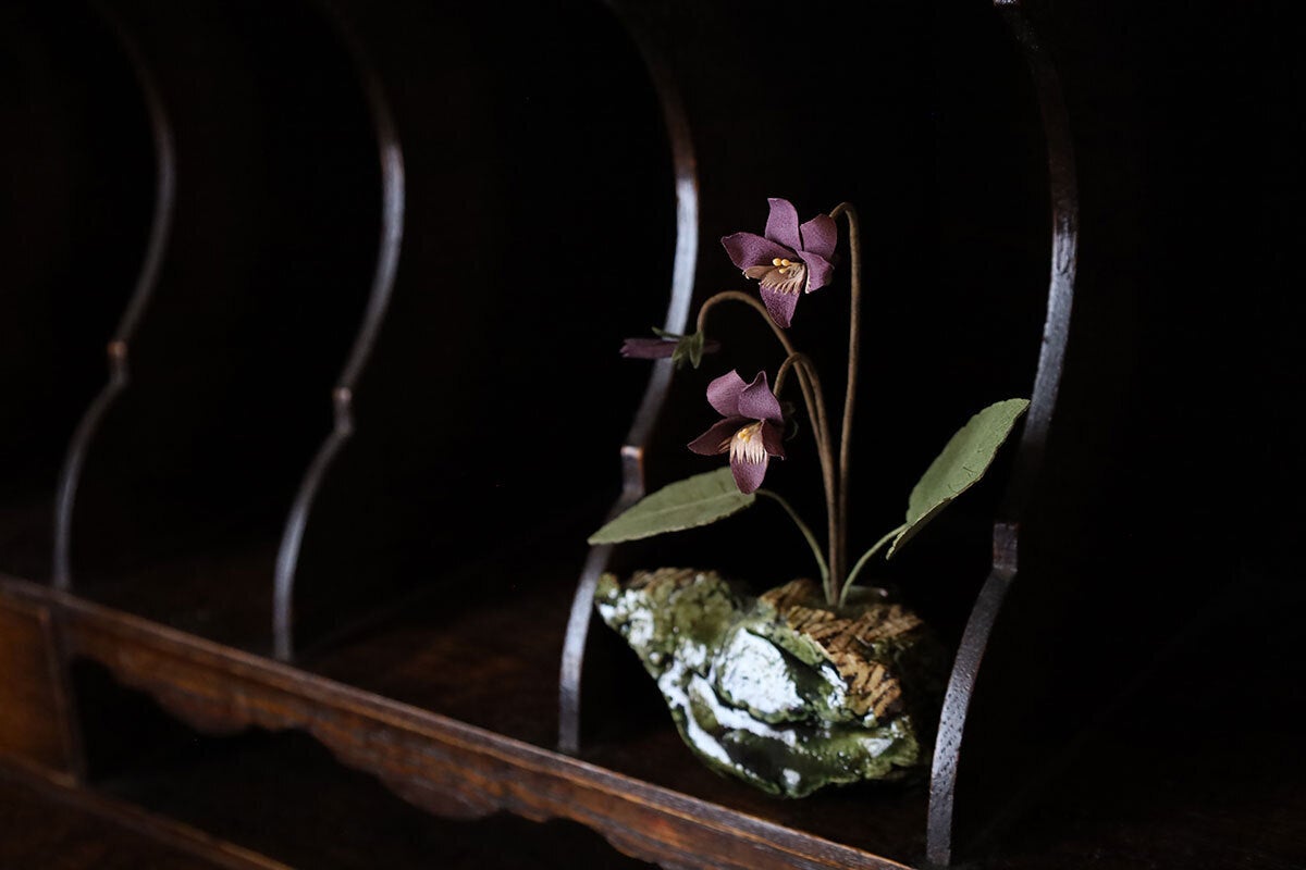 社花にもしている、私達にとって大切な花、“菫”。アトリエ店舗の一歩目はやっぱりこの花だと思い、野花を生けたように凛と咲かせてみました。革でできているので枯れないけど、無機質ではなく、時を共に感じることのできる植物です。