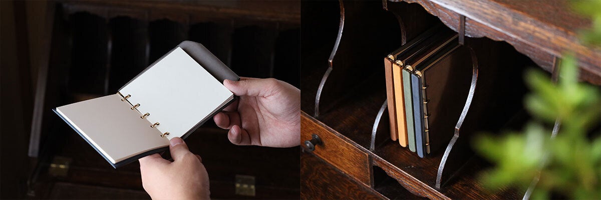 背表紙がバインダー金具になっているので、リフィルを交換したり気分に合わせて表紙を変えたり、バインダーの自由さとノートのような軽快さの嬉しい良いとこどりを実現しました。