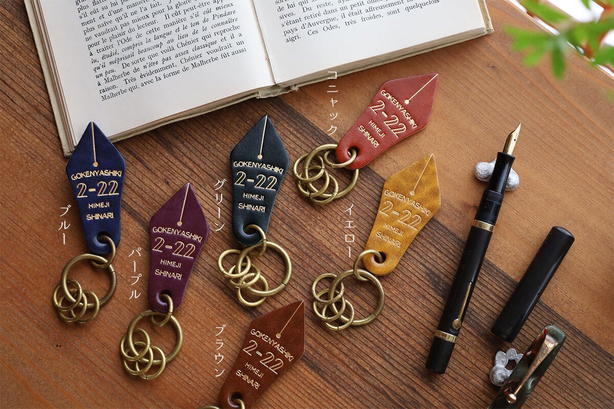 箔押しの文字は、アトリエ店舗の住所「姫路五軒邸2-22」。アトリエまでの行き方をさりげなく案内してくれます。読書好きの方には栞もございます。