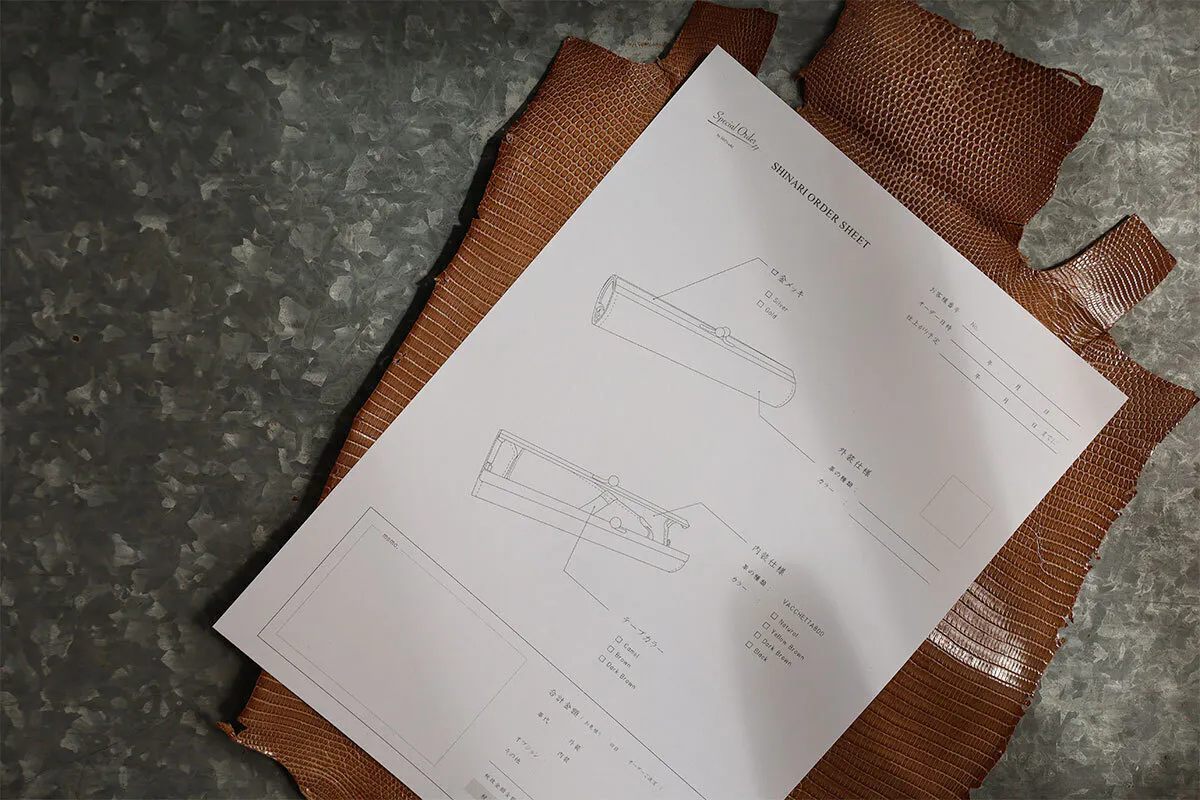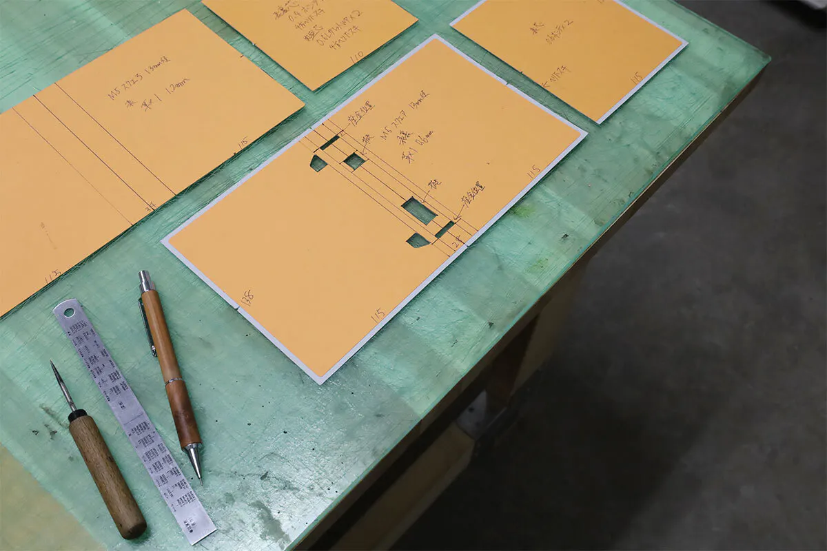 SHINARIは職人夫婦が営む皮革製ブランドなので、ひとつの商品づくりにあたってもデザイン・図面・型紙製作と、全て手作業で自分達で行っています。