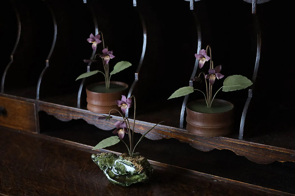 社花にもしている、私達にとって大切な花、“菫”。アトリエ店舗の一歩目はやっぱりこの花だと思い、野花を生けたように凛と咲かせてみました。革でできているので枯れないけど、無機質ではなく、時を共に感じることのできる植物です。